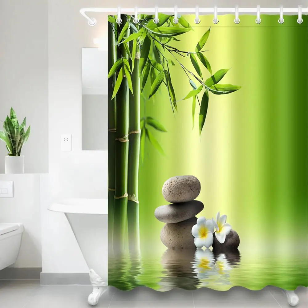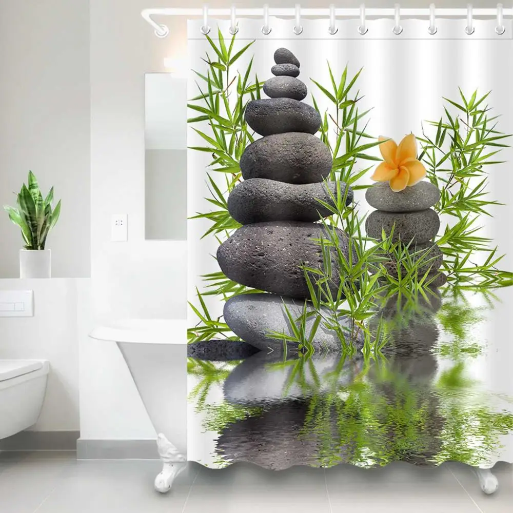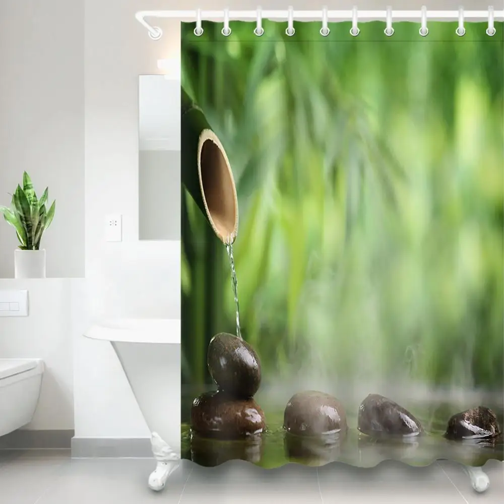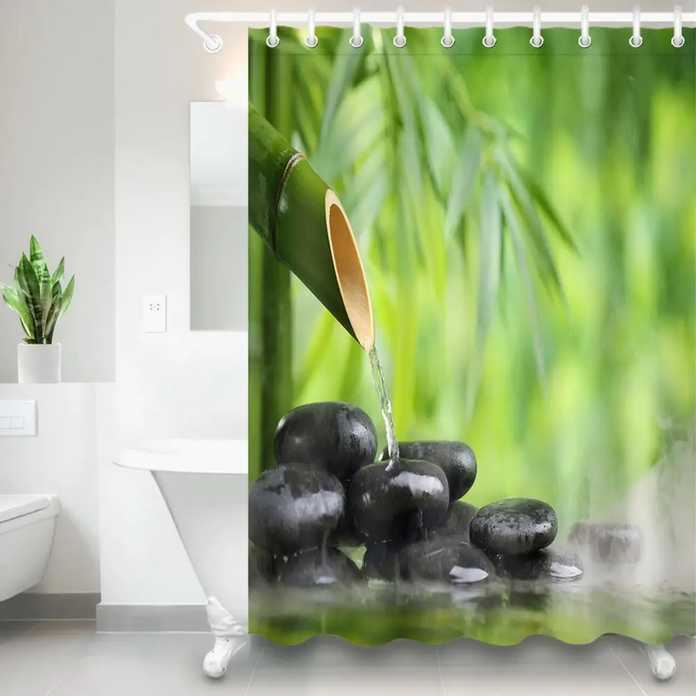 72''Asian Zen Spring Water Black Stones Shower Curtain Green Bamboo Polyester Fabric Bathroom Curtains for Bathtub Home Decor
