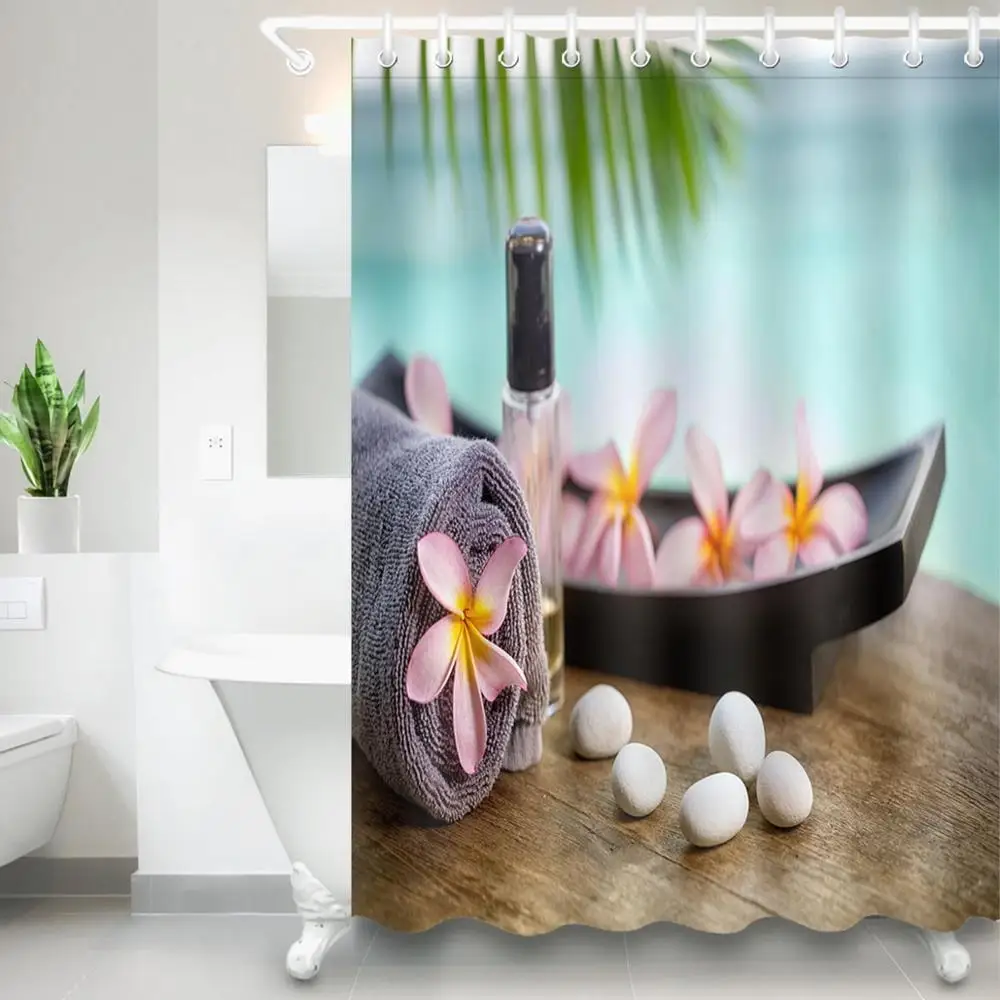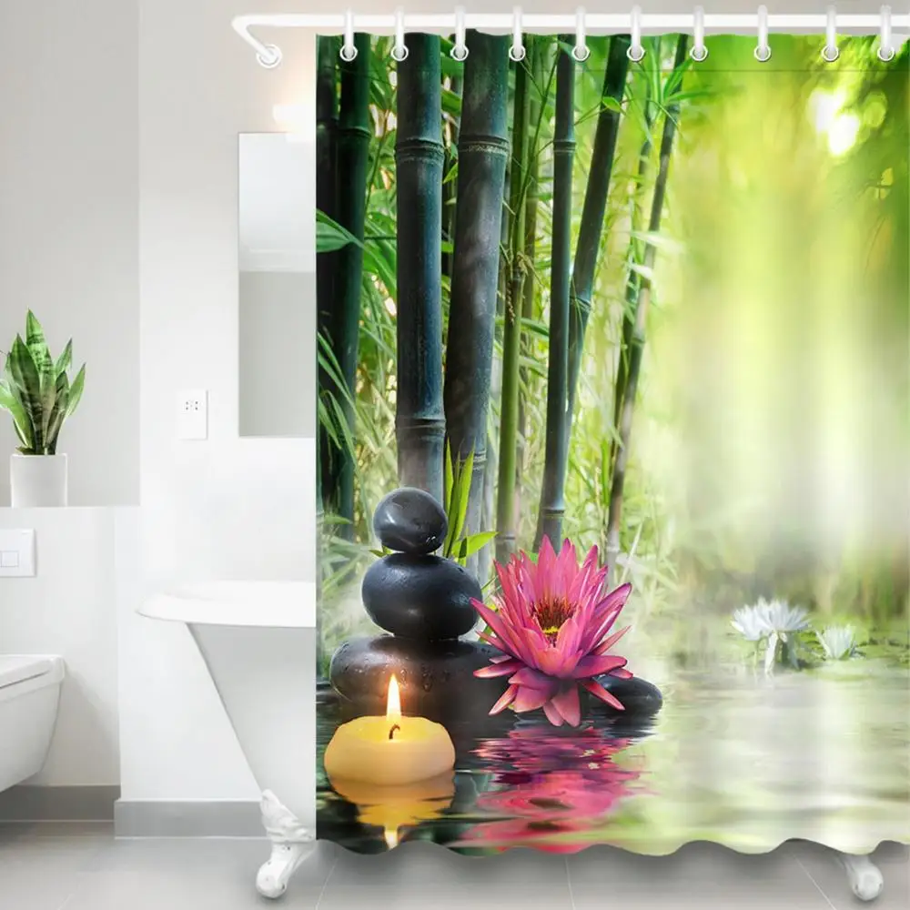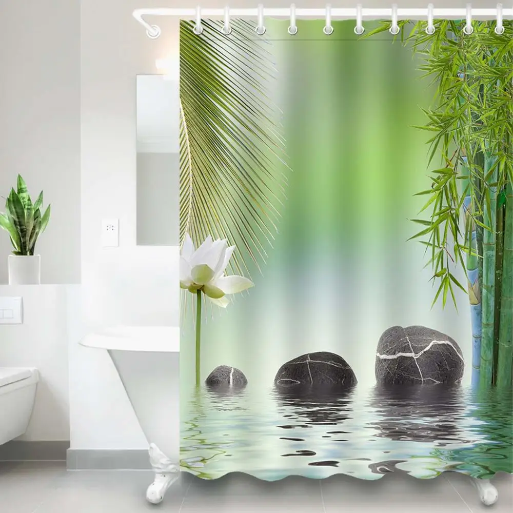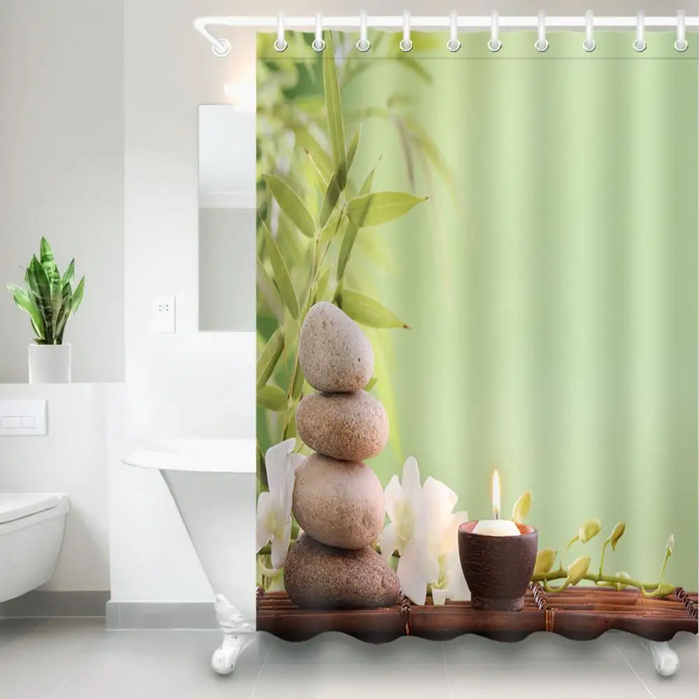 72''Asian Zen Spring Water Black Stones Shower Curtain Green Bamboo Polyester Fabric Bathroom Curtains for Bathtub Home Decor