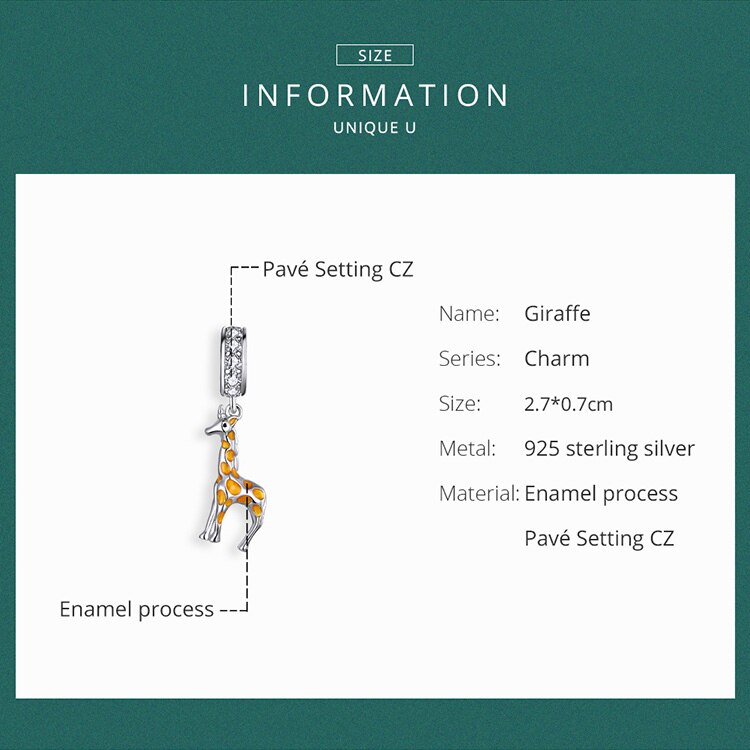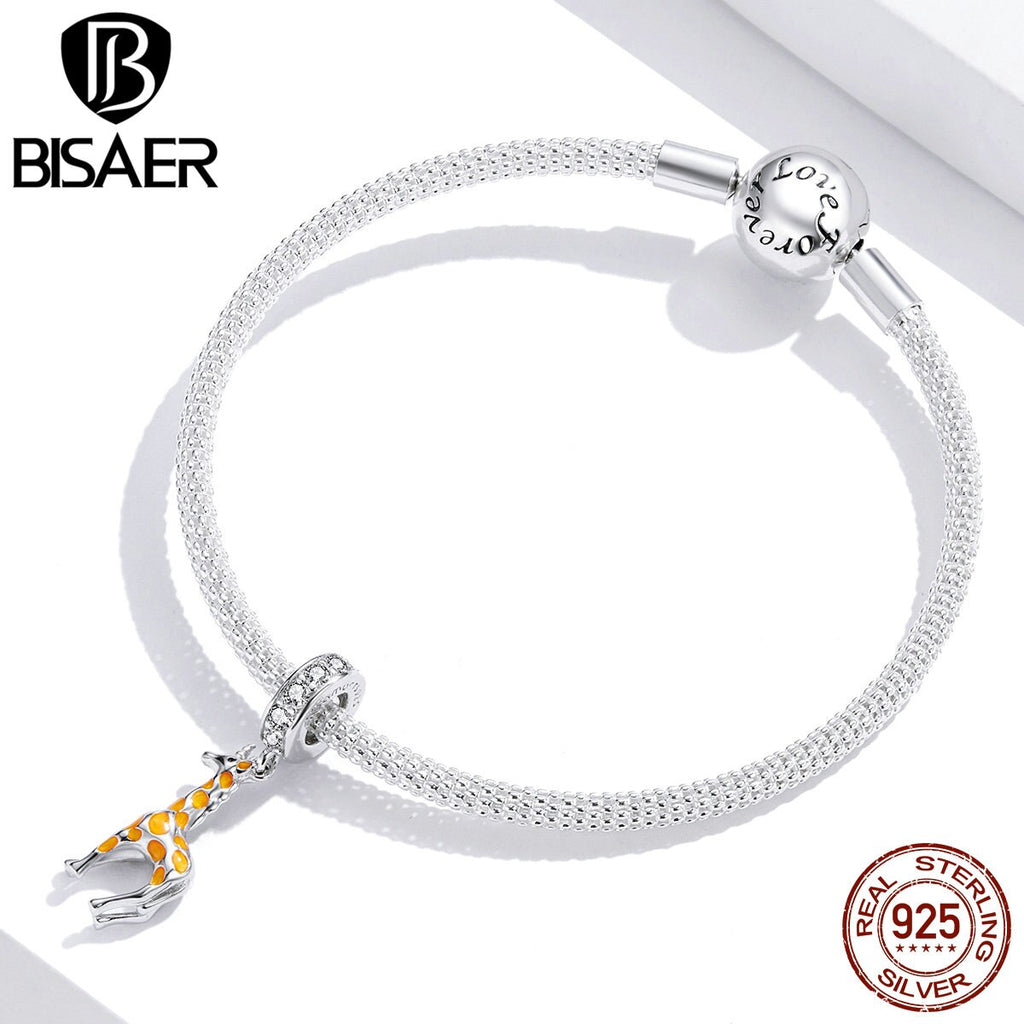BISAER Animal Giraffe Dangle Charm 925 Sterling Silver Enamel CZ Beads Pendant DIY Original Bracelets Necklace Jewelry EFC258