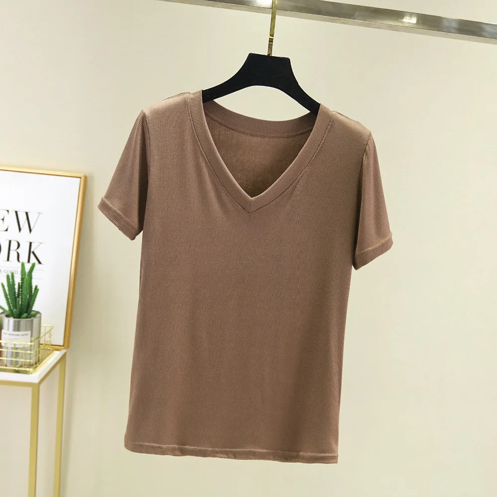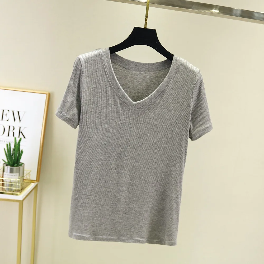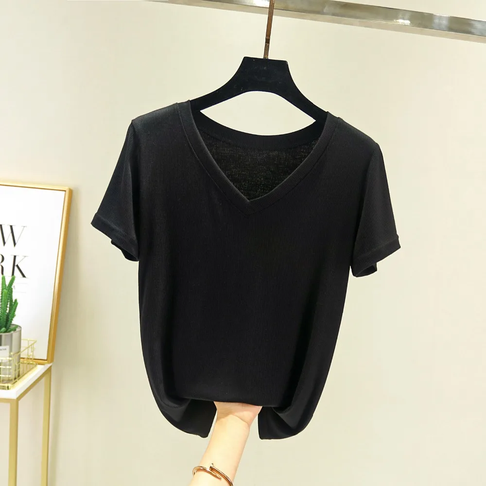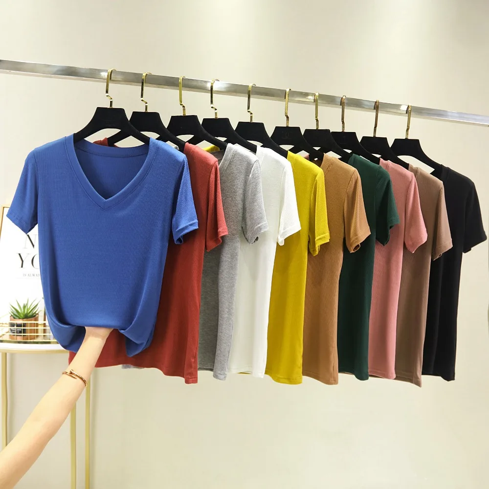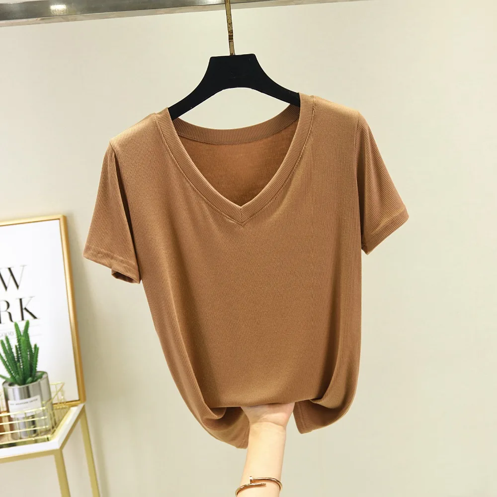 chic casual Cotton T Shirt Ribbed Short Sleeve Women Summer Basic v-neck T shirt Loose Candy Color T-shirt Tee Female
