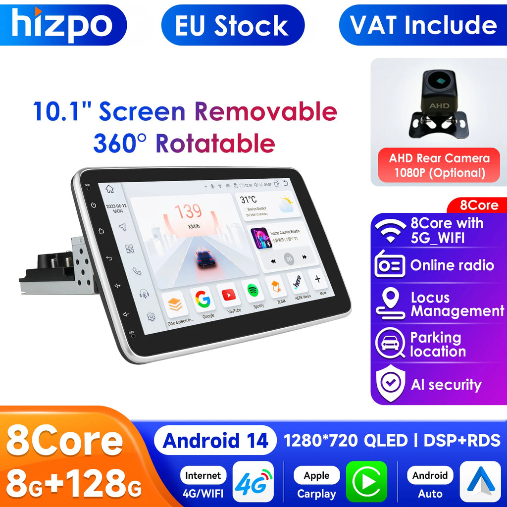 1 Din Android Car Stereo Radio 10.1 Rotate Touch Screen Removable for Universal Carplay GPS Navigation Bluetooth WIFI Autoradio
