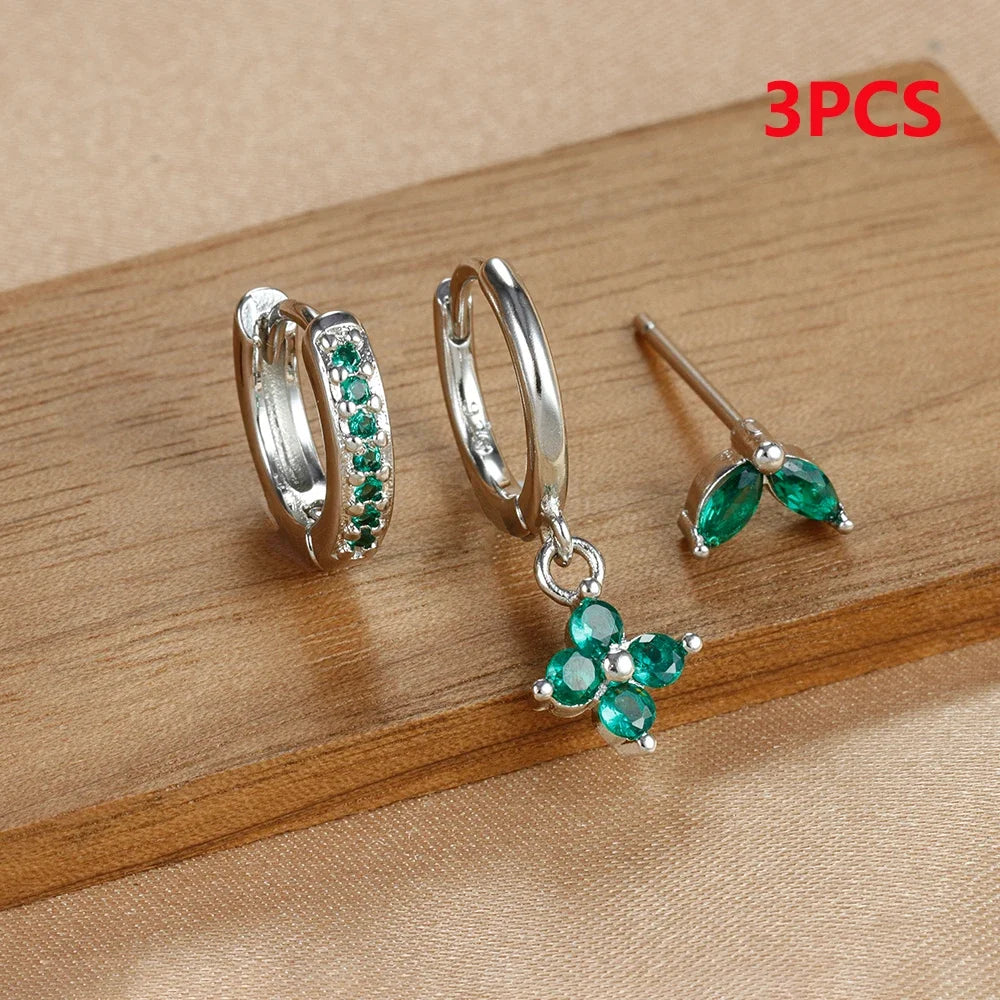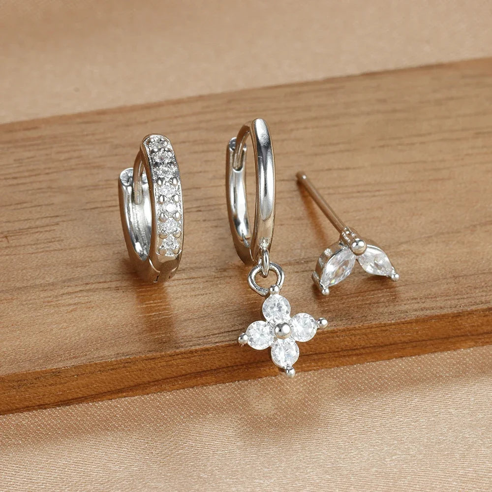 3PCS Stainless Steel Gold Color Four Flower Hoop Earrings Set for Women Elegant Zircon Pendant Huggies Piercing Trendy Jewelry