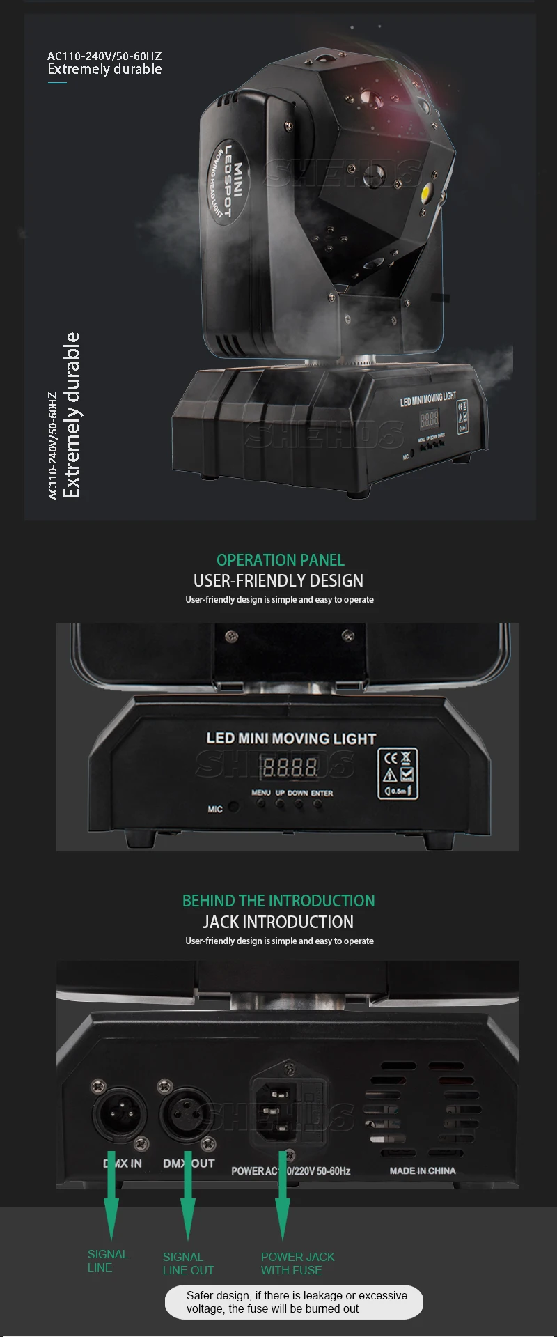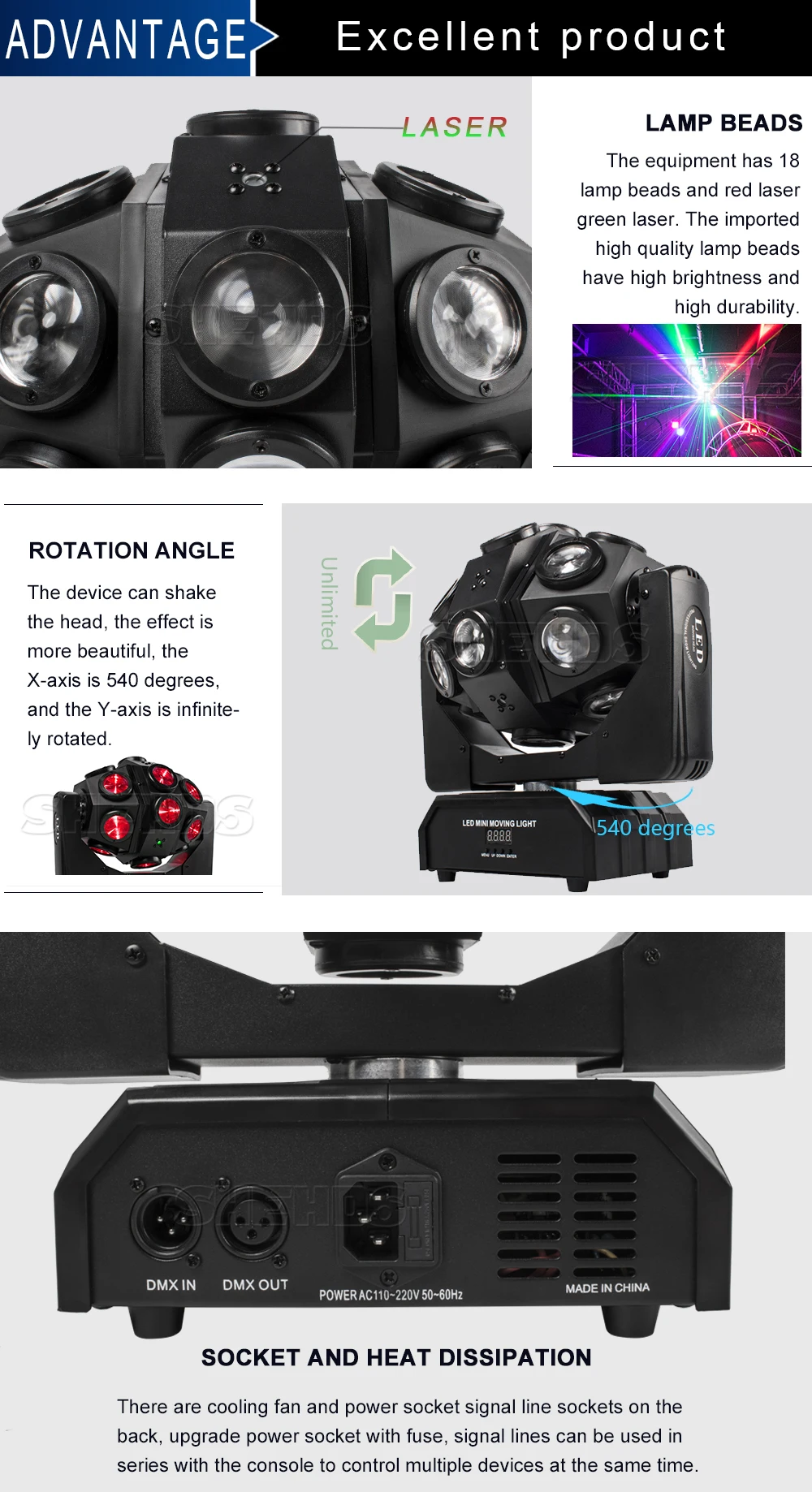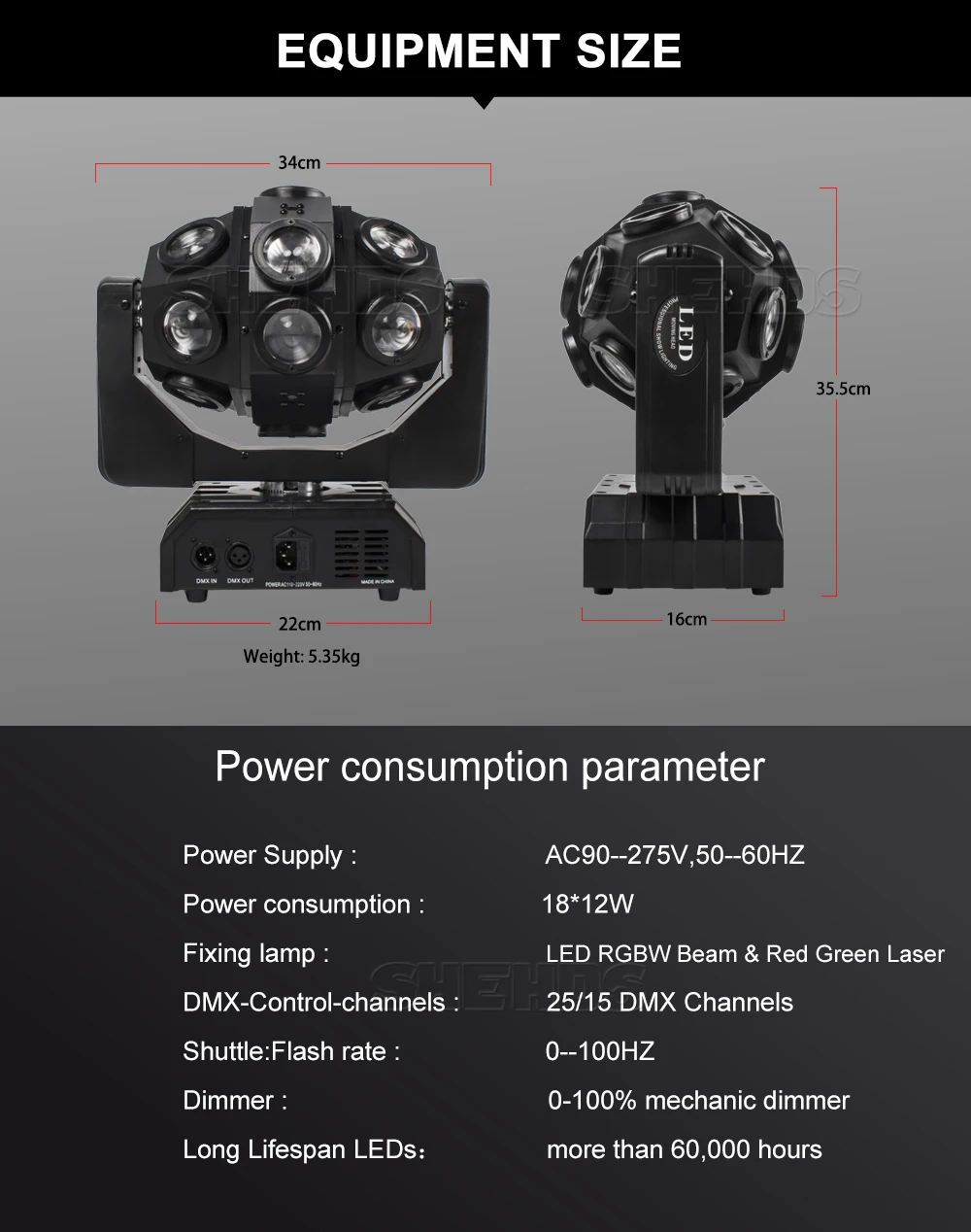 8. Control Mode: DMX512, Sound Control, Stand alone, Strobe 1-100Hz