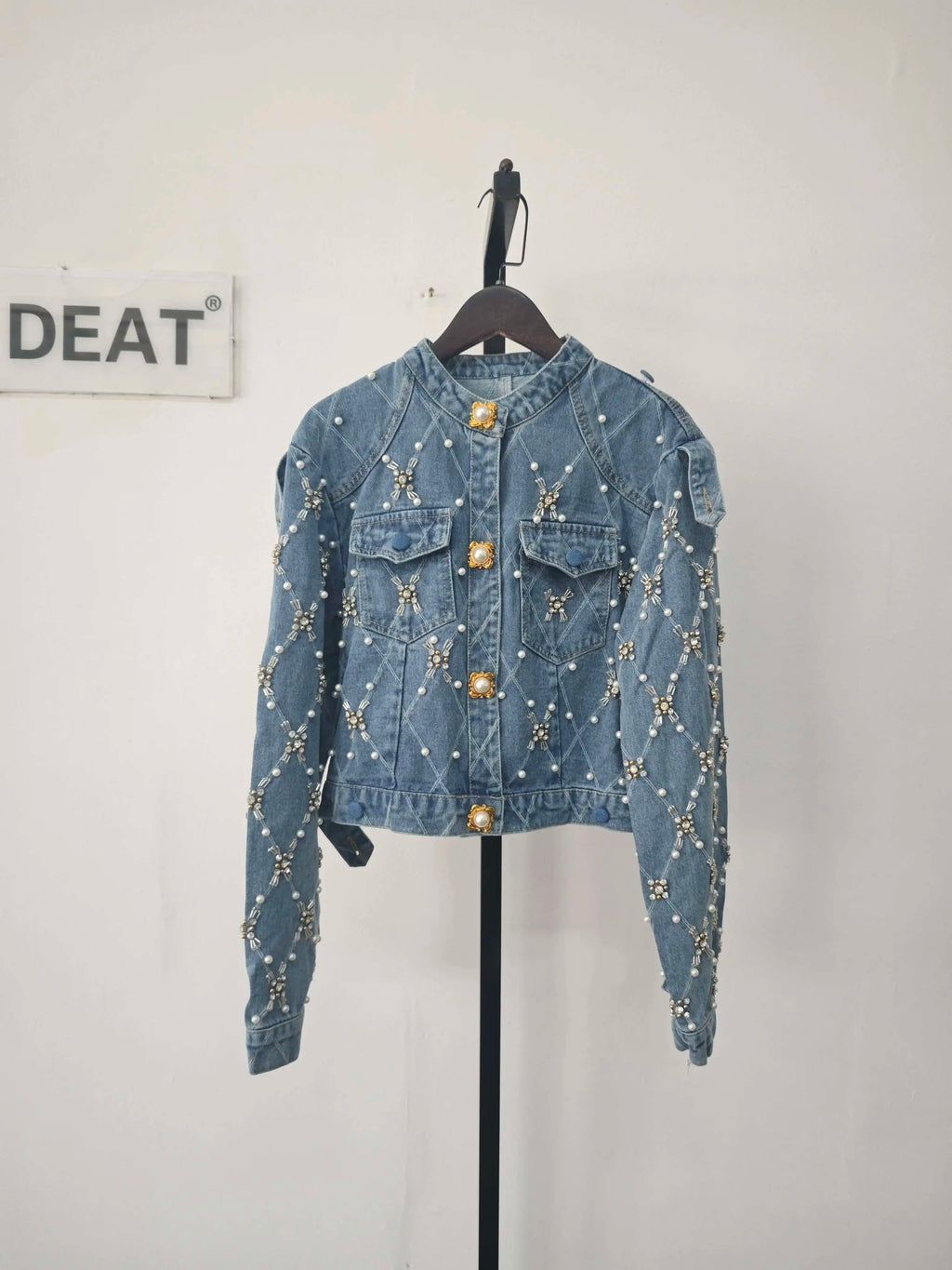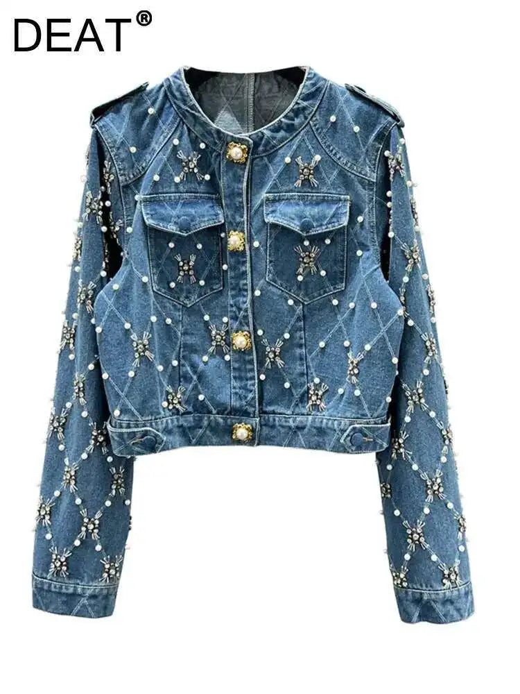 DEAT Women's Denim Jacket O-neck Embroidered Flares Diamond Pearls Buttons Plaid Elegant Coat 2025 Summer New Fashion 29L6353