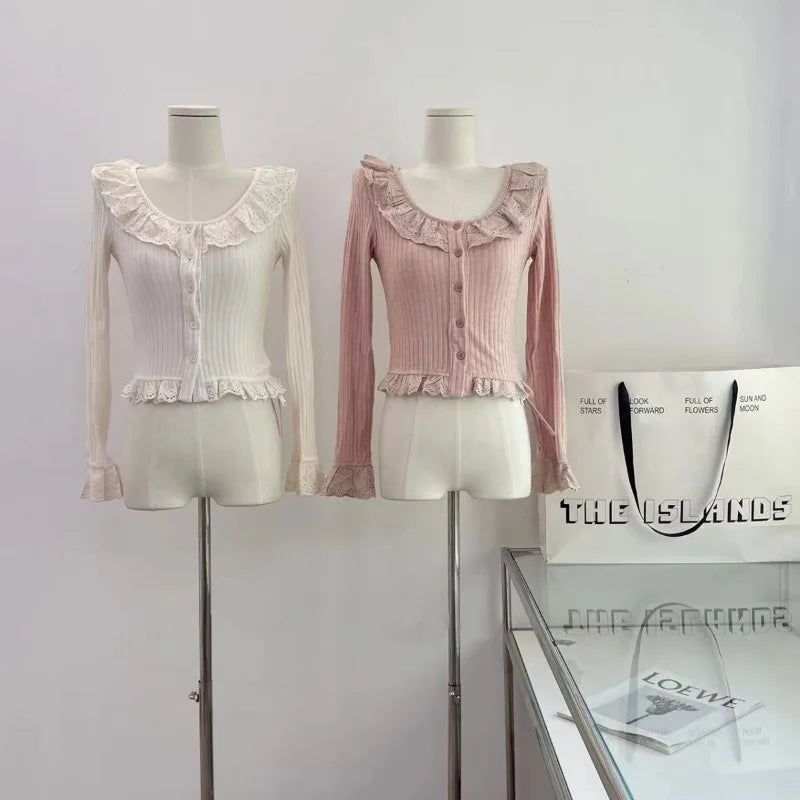 Deeptown Kawail Knitted Cardigan Lace Basic Slim Sweater Korean Fashion Women's Aesthetic Knitwear Spring Japanese Fashion Sweet