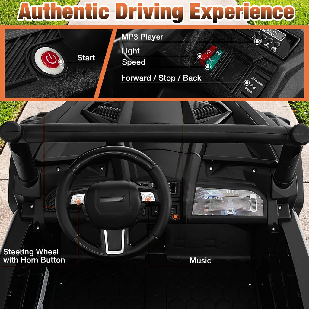 24V 2-Seater Ride On UTV: This electric UTV is driven by a robust 24V 7AH battery that ensures extended playtime for your little explorers. Besides, the spacious 2-seat design with 3-point safety belts can easily accommodate 2 kids over 3 years old while the lockable doors ensure higher safety. 4WD/2WD Switchable and Powerful Motors: Experience the thrill with this 24V kids ride-on UTV, equipped with a robust 4 x 100W engine that can switch between 4WD and 2WD. This feature offers unparalleled power and traction, providing a smooth and exciting ride for your child on various terrains. Smooth and Realistic Driving: The 24V ride-on UTV boasts wear-resistant and anti-slip wheels with suspension spring system that tackle rough terrains with ease, such as asphalt road, brick road, boardwalk and low-lying lawn. The one-button start, high/low speed, along with the forward/reverse direction also enhance authentic driving experience. Dual Control Modes: The handy remote control allows parents to supervise their children’s ride for added safety. Plus, the soft start function protects children from a sudden impact. And the kids can drive the car with the steering wheel and the pedal by themself. More Riding Fun: This upgraded electric toy car provides kids super long-playing time once fully charged. Aesthetic features like cool headlights with switch and music add to the realism and excitement of the UTV. Moreover, it is an ideal gift for your child on birthday and festival. Specifications Material: PP, Metal Overall Dimension: 126 x 80 x 80 cm (L x W x H) Seat Size: 24 x 19 x 30 cm (L x W x H) Maximum Load: 50 kg Speed: 3.5-5.5 km/h Charger: 24V, 800 mA Rechargeable Battery: 24V, 7AH Motor: 24V*4 Charging Time: 8-12 Hours Applicable Age: over 3 years old Play Time: 60 Minutes Battery Type of the Remote Control: 2 x AAA Battery (Not Included) Net Weight: 26 kg Package Includes: 1 x Ride on UTV 1 x Remote Control 1 x Charger 1 x Instruction