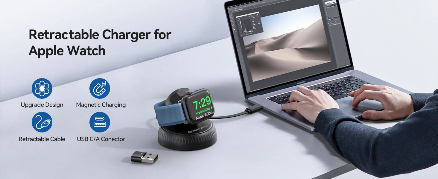 What You Get: The package includes 1*for apple Watch charger station with USB-C retractable cable, 1 USB-A adapter, and 1 user manual.