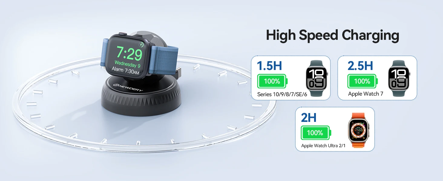 Supports Nightstand Mode: The charging station allows to activate Nightstand mode for Apple Watch, turning it into a mini bedside clock while it charges—ideal for overnight use. (Ensure Nightstand Mode is enabled in your watch settings for your portable charging dock.)