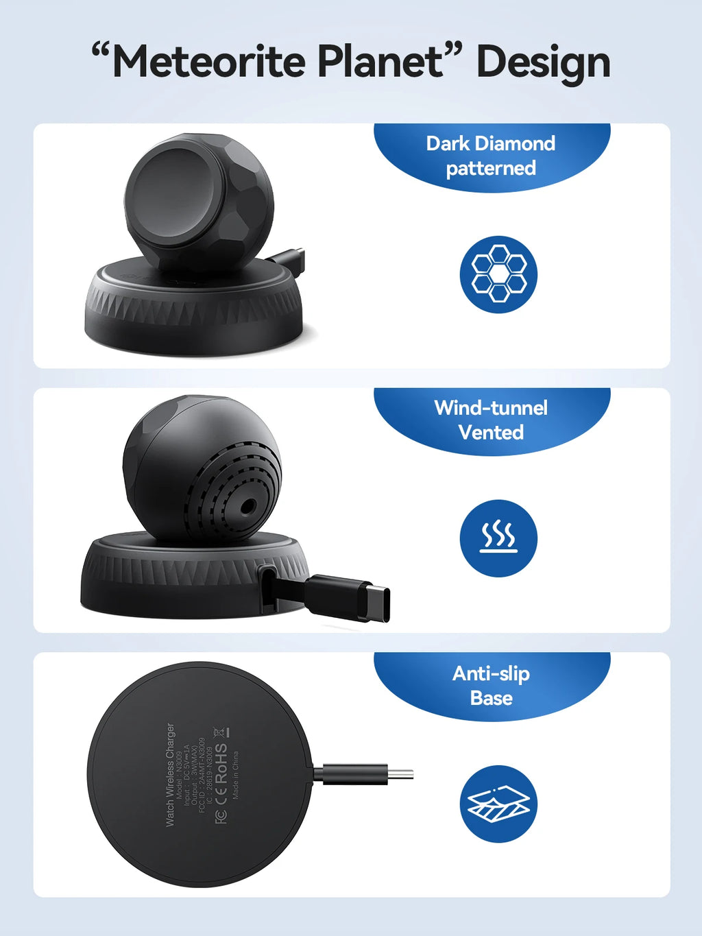 Powerful Magnetic and Anti-Slip Base: Equipped with magnetic modules that are 10 times stronger than others, this charging station aligns effortlessly with Apple Watch for secure and efficient charging. The upgraded anti-slip base (weighing 95g) also provides stability during use.