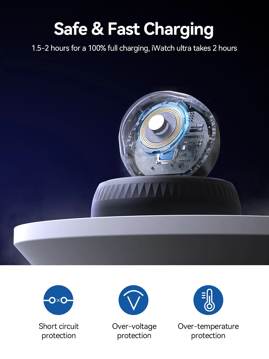 One-Step Fast Charging: With our all-in-one smartwatch charger and a power source, intelligent chip technology fully charged in about 2 hours for iWatch Series 10/9/8/6 (2.5 hours for Series 7 and 3.5 hours for Apple watch Ultra). Enjoy charging safety protections against overcharging, overheating, and short circuits.