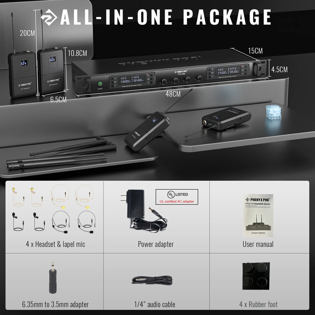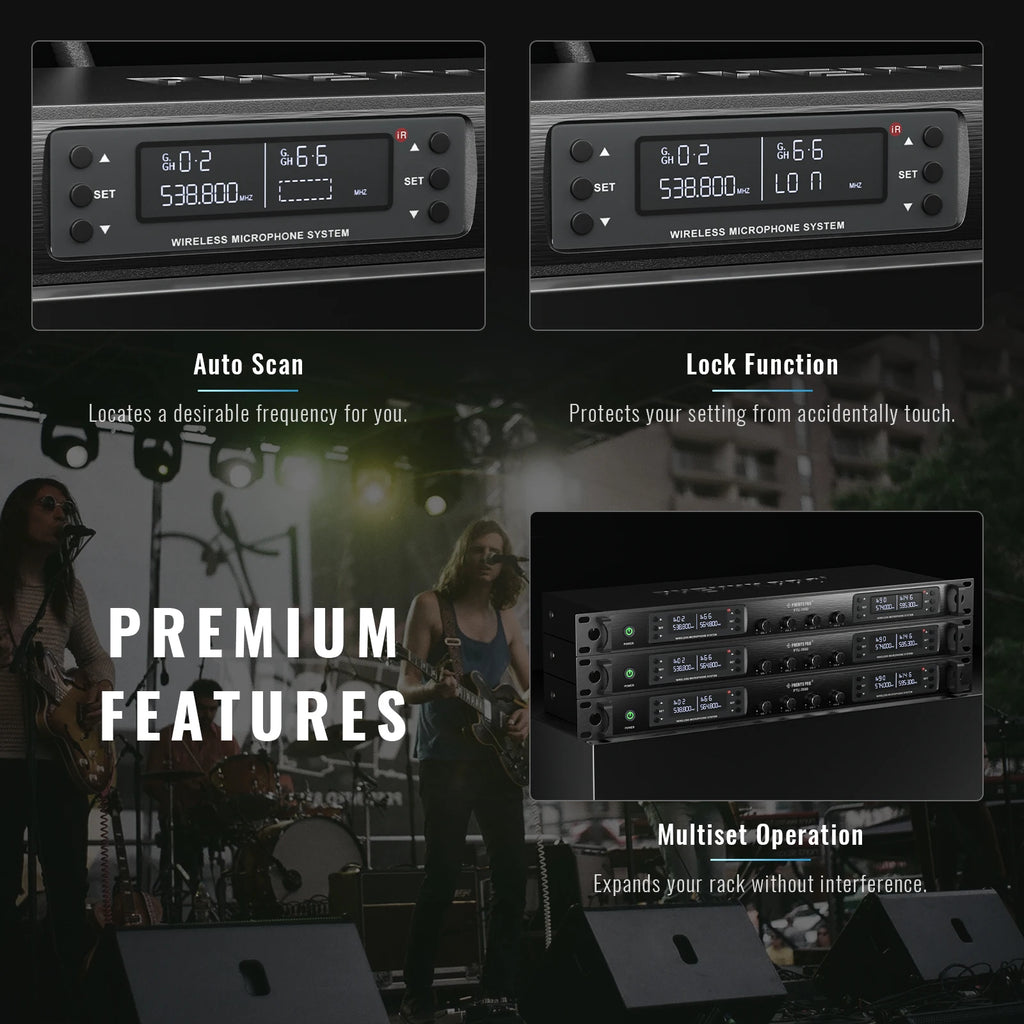 UHF microphone system equips with auto scan function, which enables the system to search for the least interference channel to pair up with transmitters. It also has one 1/4’’ mixed output and 4 XLR separate outputs. 4 antennas design increases the anti-interference ability and decreases interference between each channel. Ideal for church, wedding, karaoke, DJ, stage shows, public speaking, etc