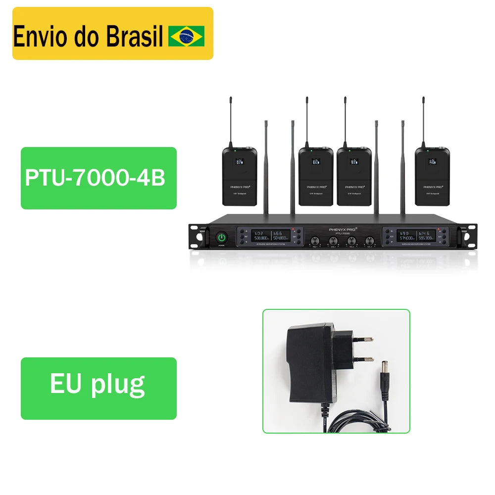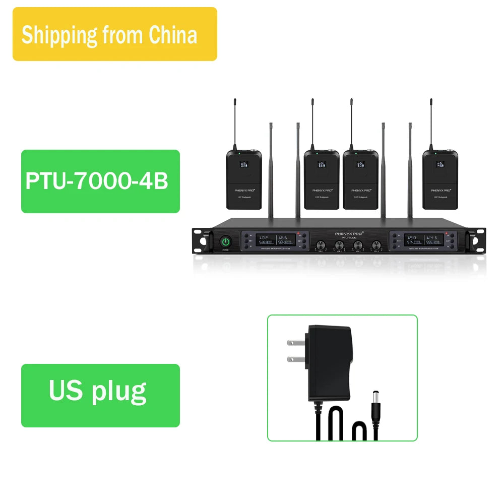 4 channel UHF wireless microphone system with selectable frequency.