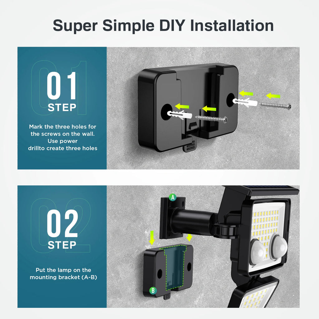 【4-Head Design and Wider Illumination Area】 The upgraded version features a creative four-head design, with four adjustable heads that can move up, down, and horizontally, detecting a wide illumination angle of up to 270 degrees and a sensing distance of 40ft, providing extra brightness and a wider visible area, ensuring that sunlight is absorbed to the maximum at every angle.