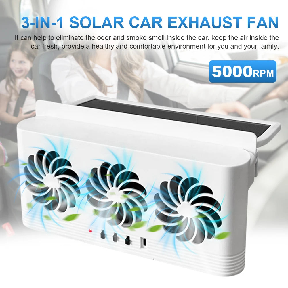 Solar Powered Car Radiator Cooling Fan with 3 Air Outlets Car Window Air Vent Fan Eliminate Peculiar Smell Auto Ventilation Fan for All Cars