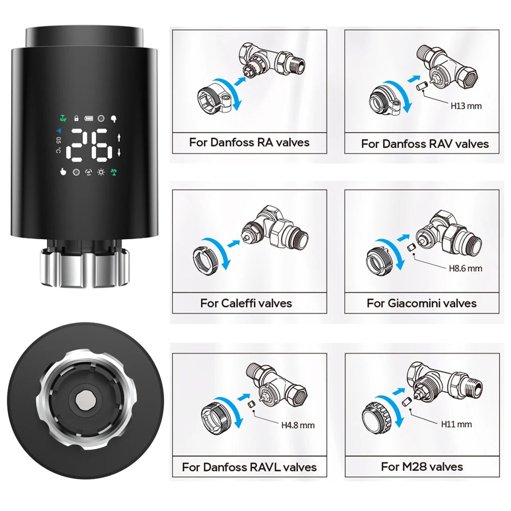 1.Smart Tuya ZigBee Radiator Actuator Thermostat:New mini design with simple and clear LCD display screen on the body,the radiator thermostat is with LCD digital display screen and two sections of AA batteries powered,which is a special valve using cooperatively with heating radiator.Artificially set indoor temperature, mainly used in the floor heating system to control the closing and opening of the pipe 2MQTT Setup Available.
