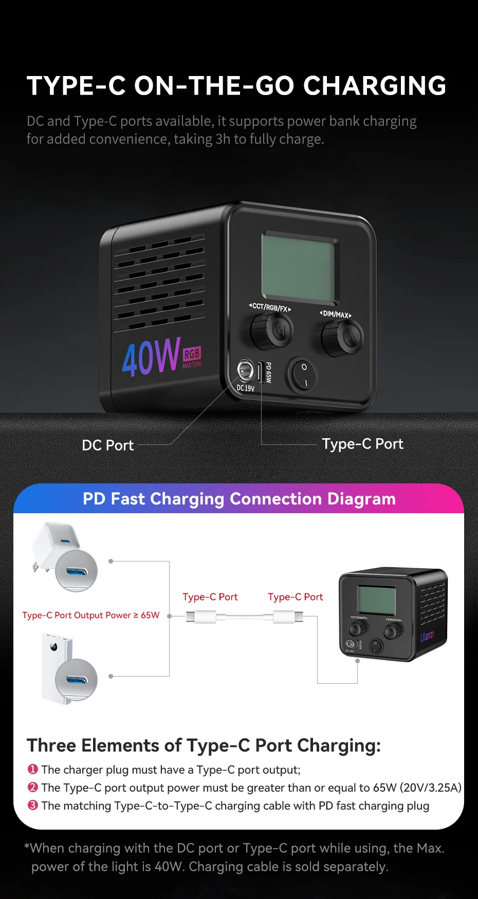 Tips: When charging with the DC port or Type-C port while using, the max power of the light is 40W. Please make sure that your charger and charging cable support charging with PD up to 65W. Charging cable is sold separately.