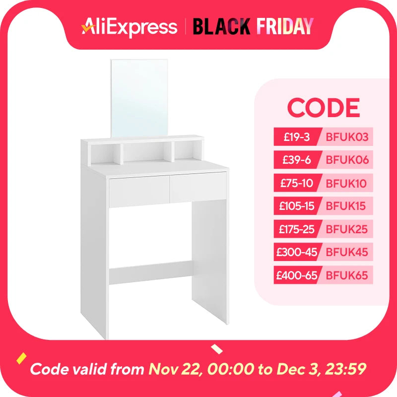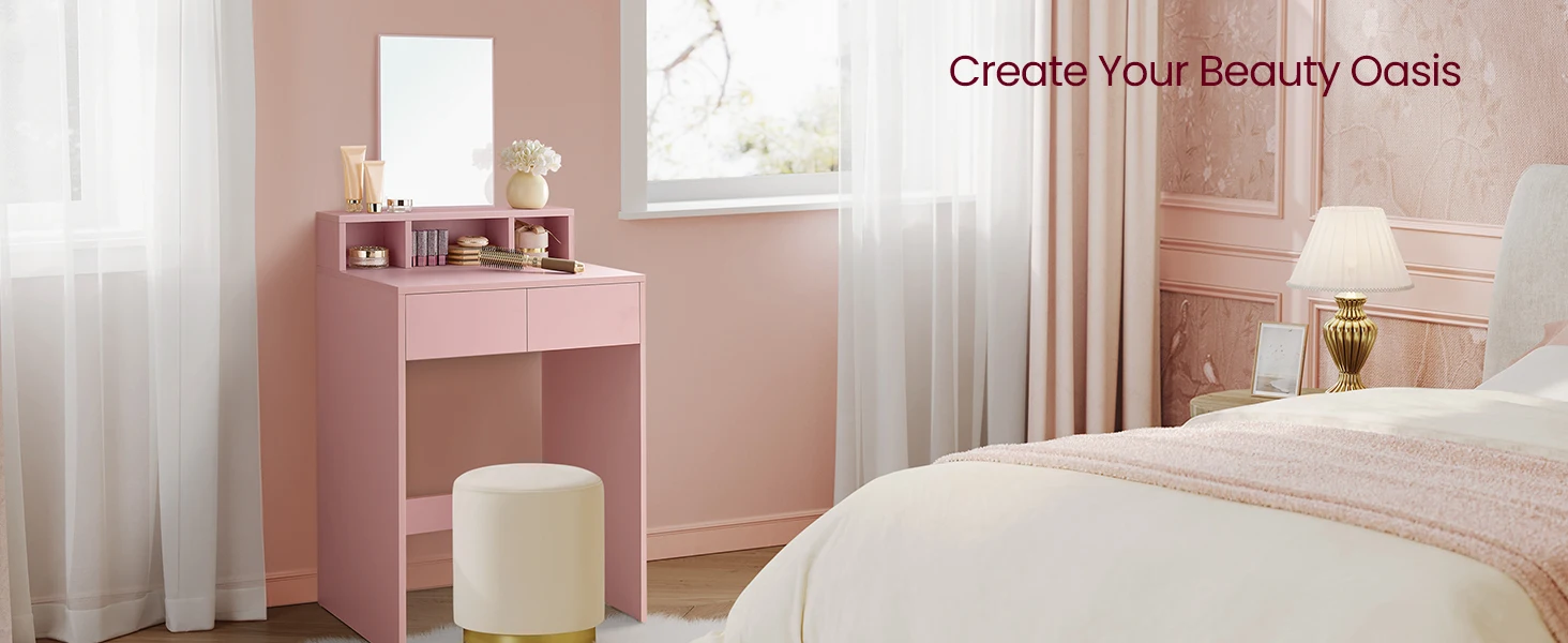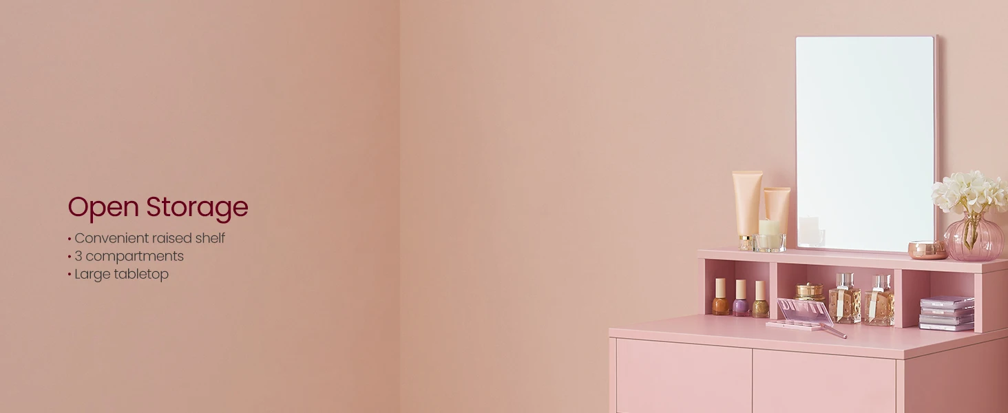 - [Roomy Yet Space-Saving] Featuring 2 drawers, 1 large shelf and 3 open compartments, this dressing table offers plenty of space to keep your cosmetics tidy and within reach. Taking up only 40 x 60 cm of floor space, it’s perfect for small spaces