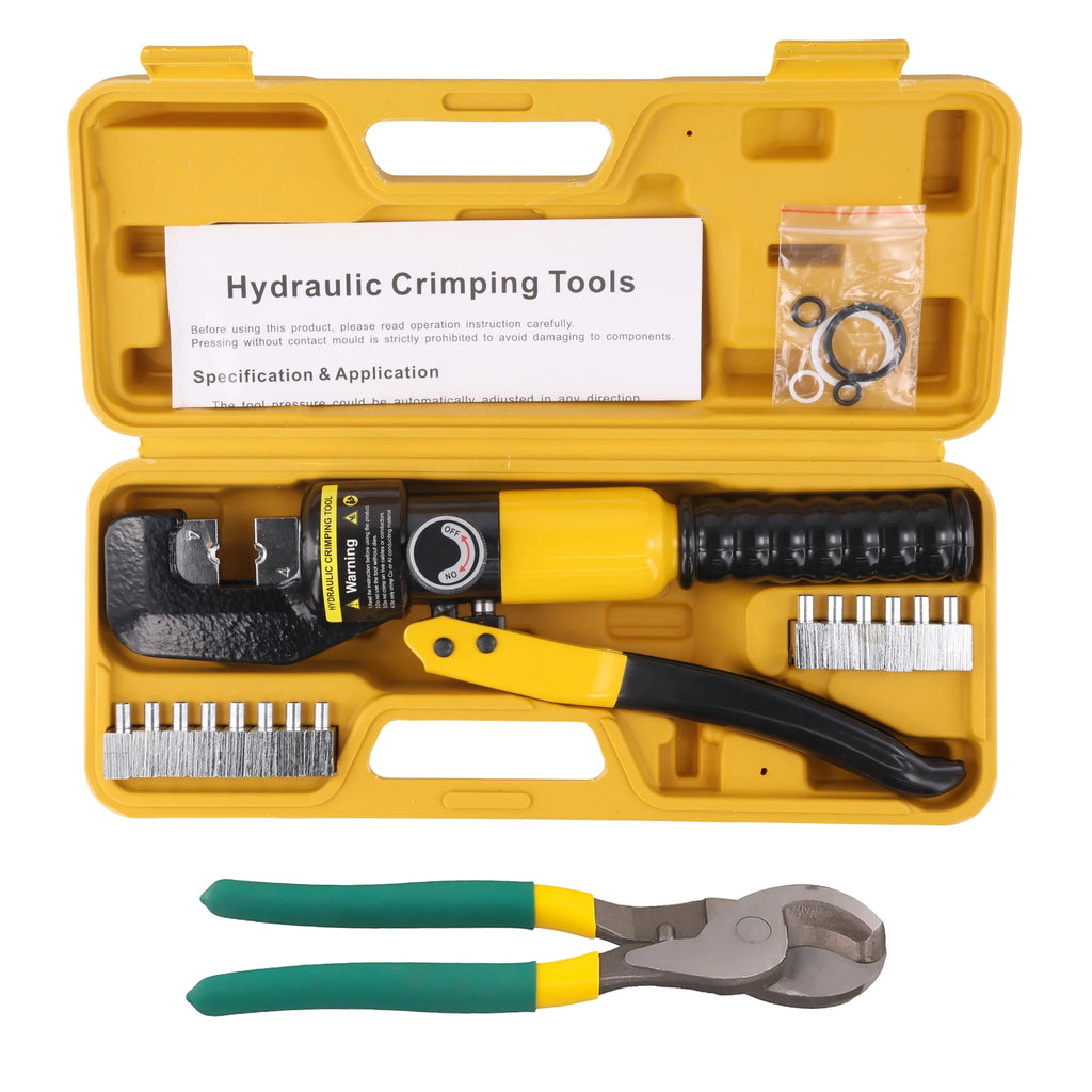 STRONG MATERIAL -- Hydraulic wire crimper tool Hardened and tempered at high temperatures for excellent toughness and no risk of breakage. Hydraulic Hand Crimper Tool is made of high quality 45 gauge hardened steel with a chrome plated finish. Handles are vinyl imported for comfortable use, easy control and non-slip features.