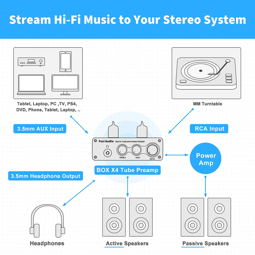 2.Tube Headphone Amplifier & Preamplifier: The Fosi Audio BOX X4's versatile design includes a 3.5MM AUX headphone and RCA output, offering a range of usability beyond expectations