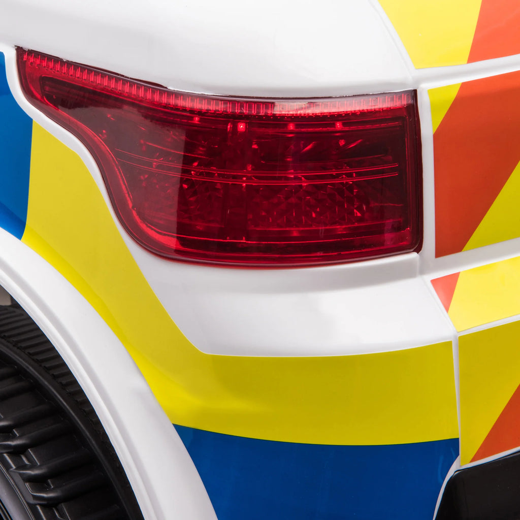 The police car from HOMCOM satisfy the dream of a kid. The ride-on provides up to 45 minutes of fun on the road if fully charged. The seat with belt, extra wide tyres, adjustable speed between 3-5km/h and remote for adult control secures the safety. Thanks to the easy to open car hood and foldable handle with auxiliary wheels, it offers much convenience. Working features of the flashing lights with siren, driving pedal and music player means your child will have an authentic riding experience.● Police car design, horn on steering wheels, working headlights and taillights, flashing police lights and wailing siren● Music can be played in following ways: USB, AUX and Bluetooth