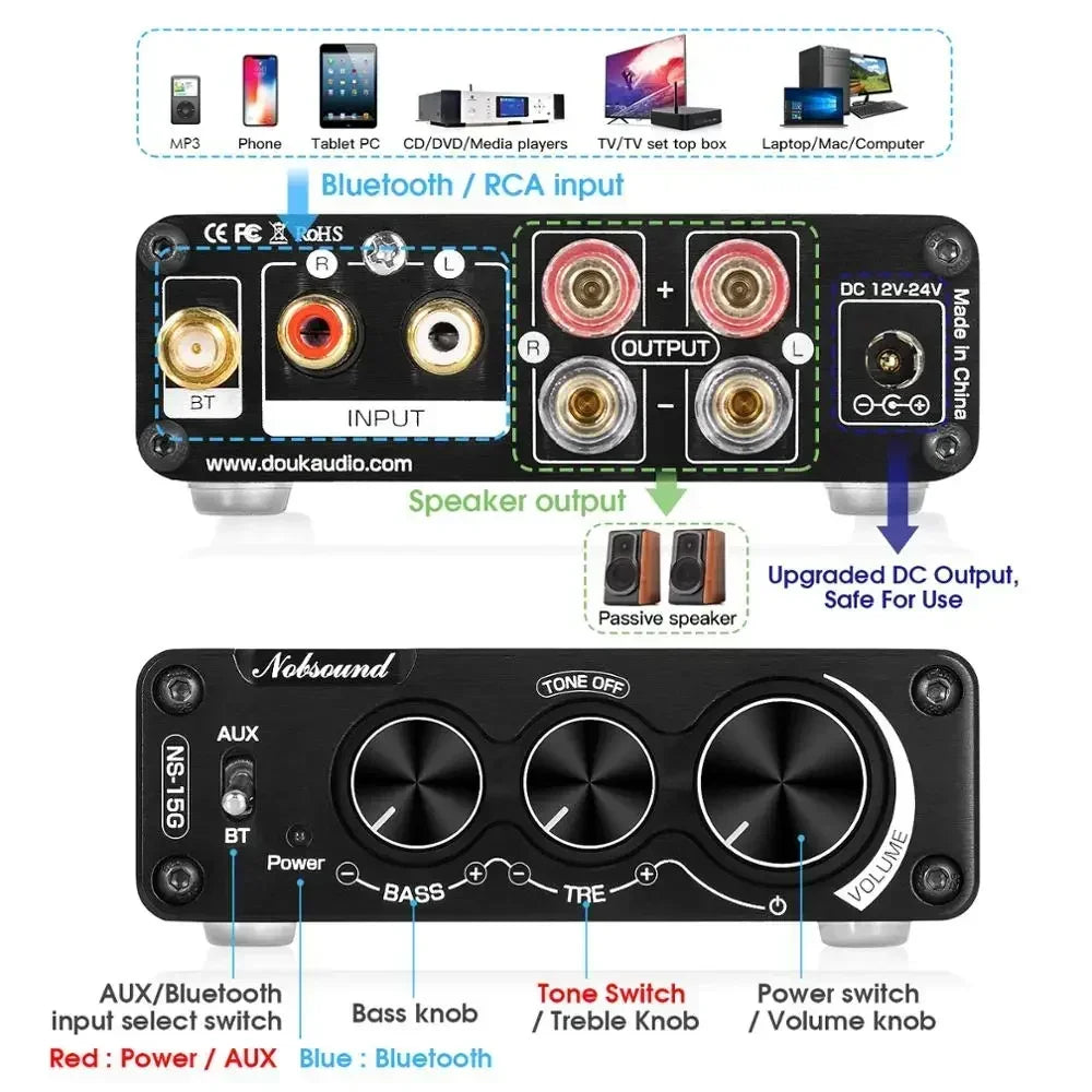Mini size and easy use but powerful and practical: with perfect protection circuit, perfectly suitable for desktop or a smaller space in home or office, easy to connect to your audio system, especially designed for the audiophiles who pursue HiFi sound.