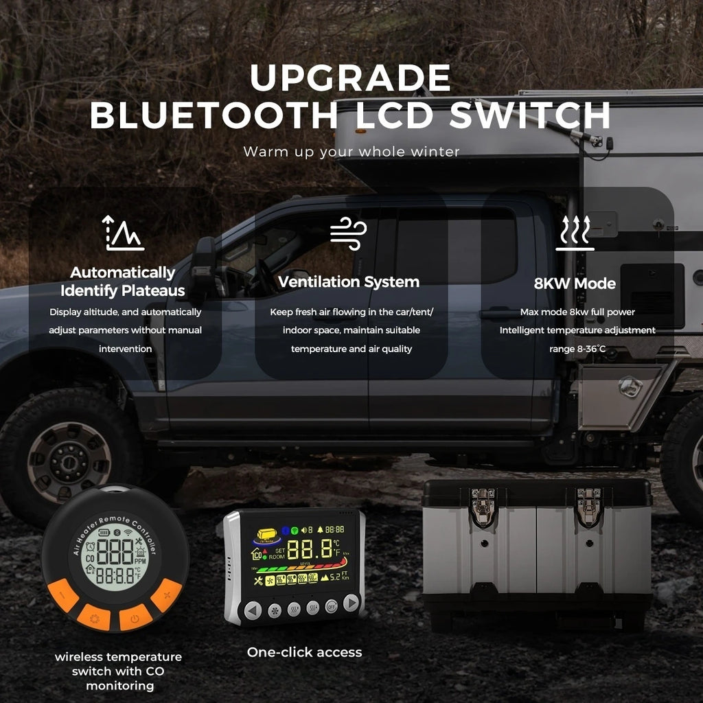 Bluetooth App---Intelligent & Facilitation -- Gain complete command with the smart app, which offers precise control over temperature, timers, power levels, altitude mode, constant temperature, and Ventiation mode settings. The Sunster diesel heater experience ultimate convenience and peace of mind.