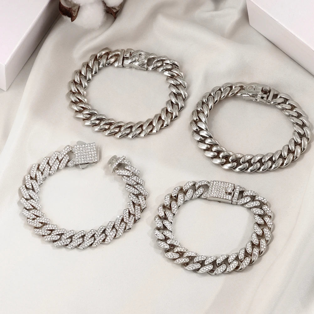 4Pcs Cuban Chain Bracelet for Women Men HipHop Bling Iced Out Chain Full Rhinestone Paved Chunky Metal Bracelet Set Jewelry Gift