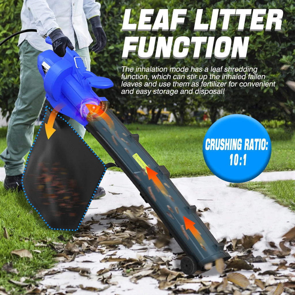 【Lightweight & convenient Design】---The lightweight leaf blower ( only 3KG) comes with 35L large capacity back dust bag, shoulder strap, Adjustable front support handle Vacuum/blower tube with support wheel and 10m power cable make it easy to move.