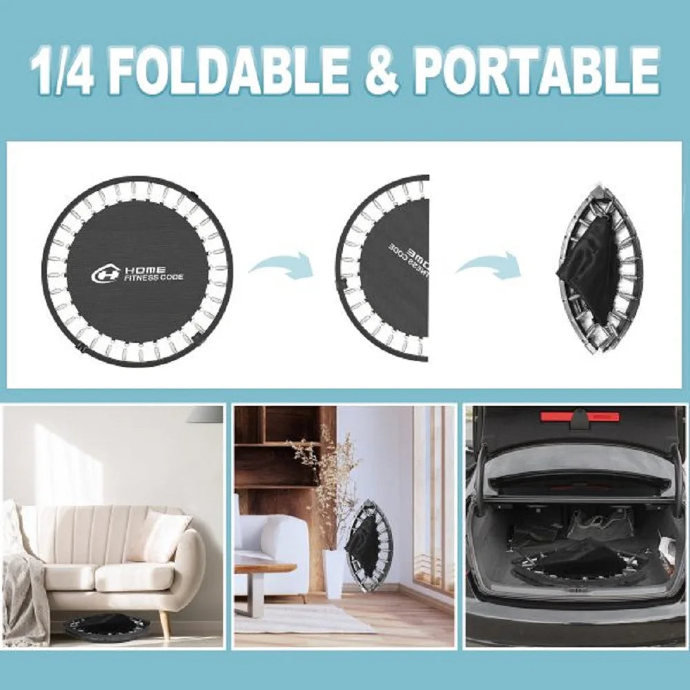 -- Portable Trampolines: The fitness rebounder, with unique frame construct, folded size less to 1/4! Easy to storage your trampoline anywhere, bed, sofa, car trunk, closet, etc.