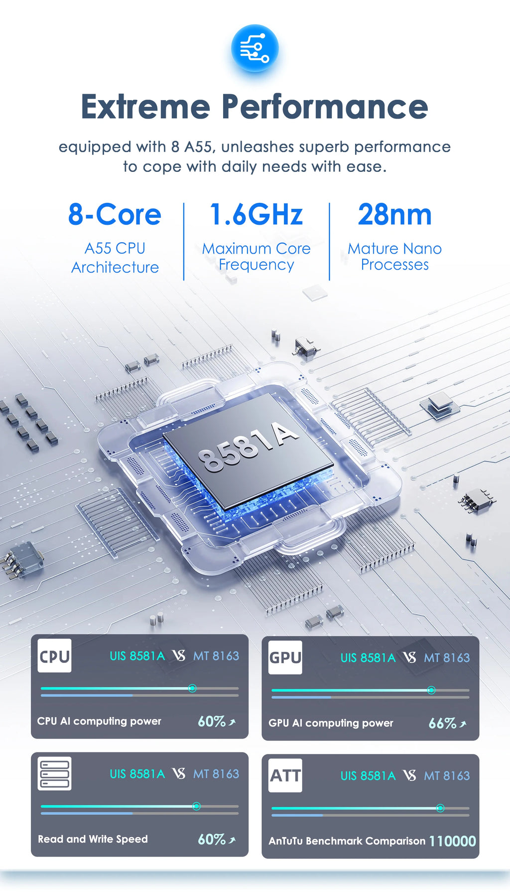 A new generation of new CPU architecture,equipped with 8 A55, unleashes superb performance
