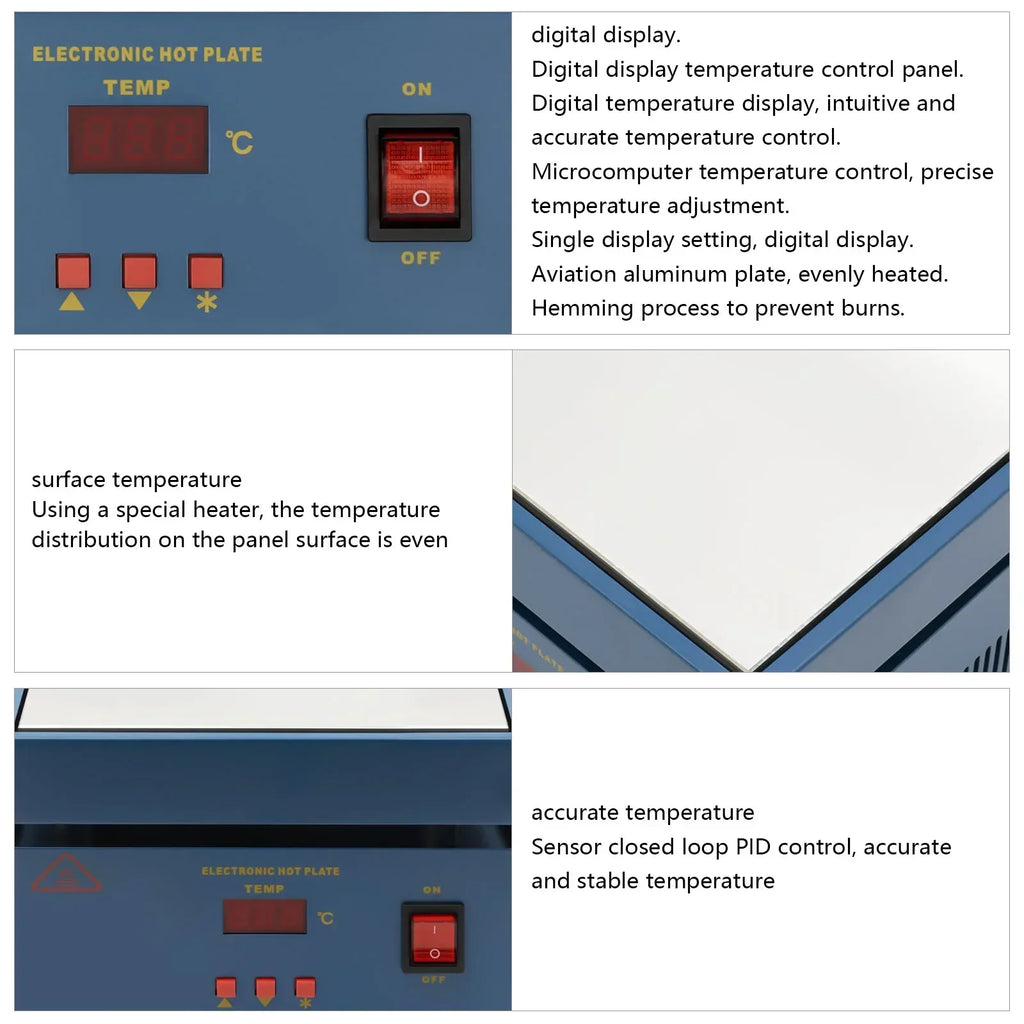 Precise and Stable Temperature Control: The micro-computerized temperature control design, the sensor closed loop PID control and the built-in temperature sensor make for precise temperature regulation. The special heater and aluminum alloy heating plate also allow for a more even temperature distribution on the panel surface.
