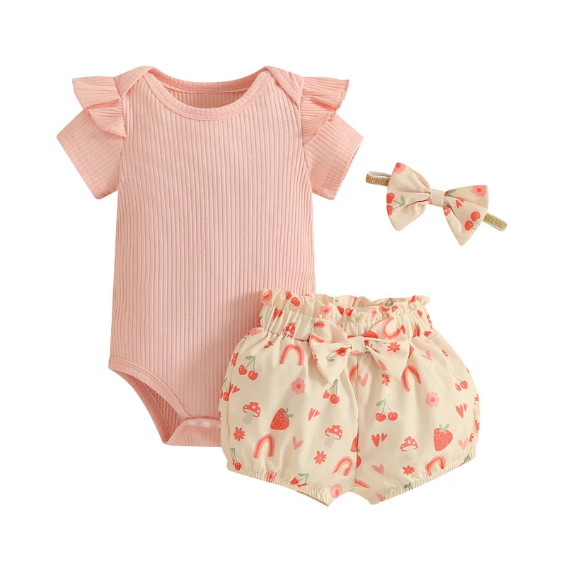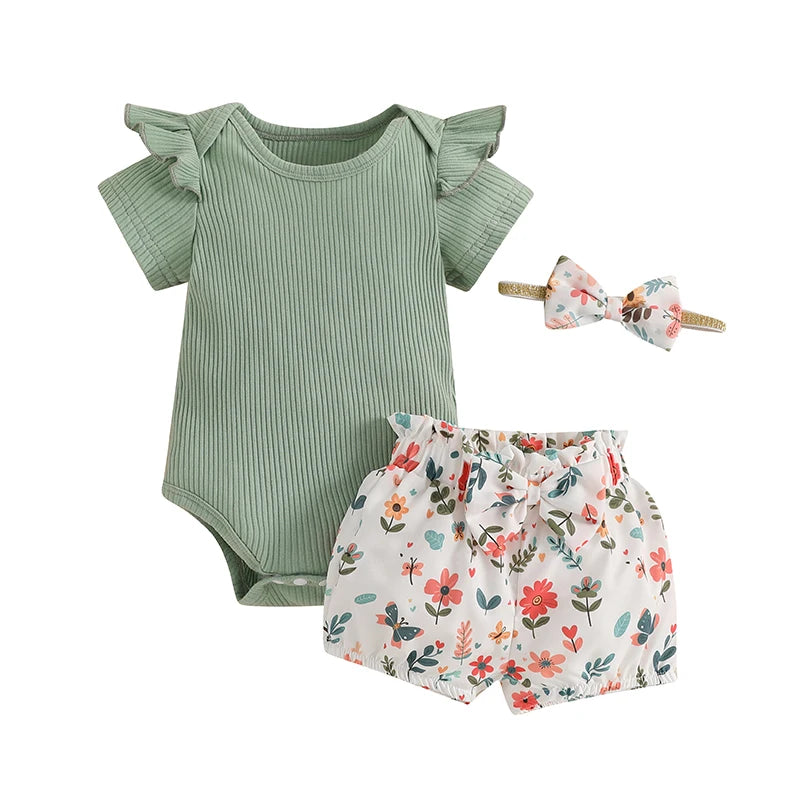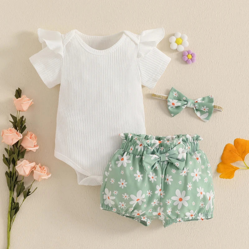 Baby Girls Shorts Set, Short Sleeve Romper with Floral Shorts and Hairband Summer OutfitWhether your baby girl is playing at the park or attending a birthday party, our shorts set is versatile enough to suit any occasion.