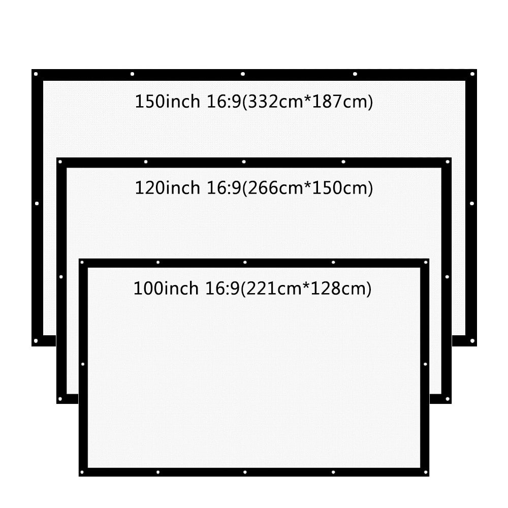 • La pantalla de proyección plegable 16: 9 de 100/120/150 pulgadas proporciona un área de visualización de aproximadamente 232 * 138 cm / 280 * 164 cm / 347 * 202 cm. Nuestra superficie de pantalla proporciona un ángulo de visión excepcionalmente amplio a 160 grados sin pérdida de resolución en cualquier ángulo de visión.
