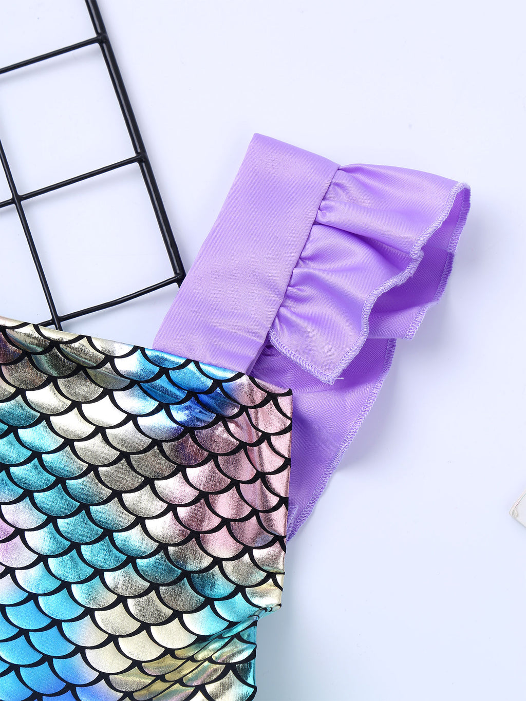 Ruffled shoulder straps, glossy mermaid fish scales pattern printed top bodice, backless.