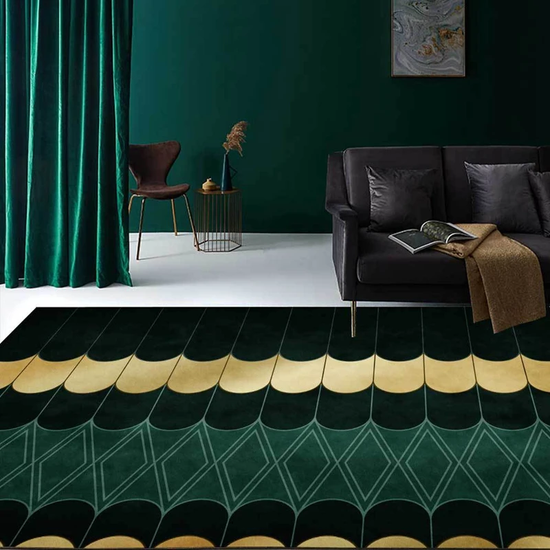 Luxury Deep Emerald Green Carpets Geometric Gold Lines White Marble Mosaic Area Rugs Livingroom Bedroom Sofa Non-Slip Floor Mat