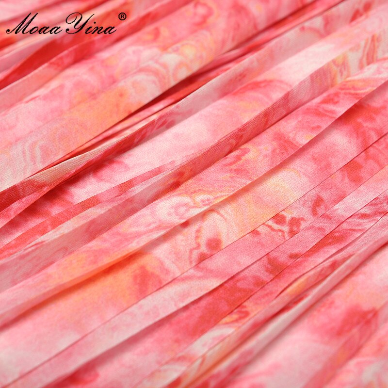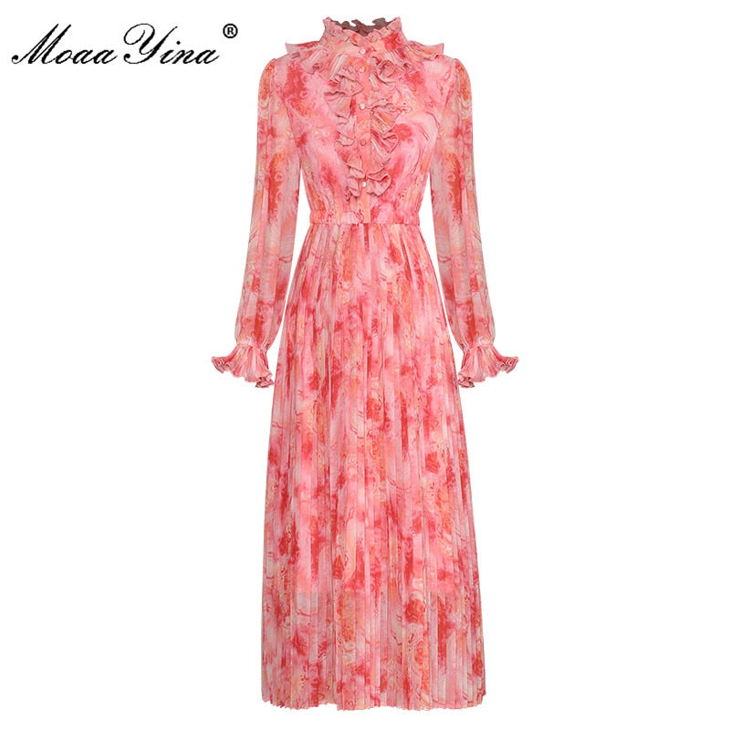 MoaaYina Fashion Designer Summer dress Women's Dress Stand Collar Flared Long Sleeve Ruffled Printing Pleated Dresses