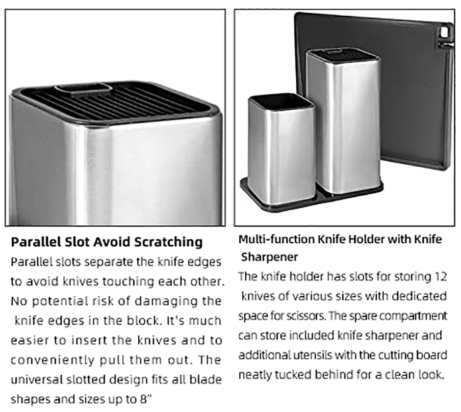 PREMIUM QUALITY MATERIALS: Knife block universal is made from superior quality, extra-durable stainless steel. The metallic finish wonrsquot rust or oxidize over the years!