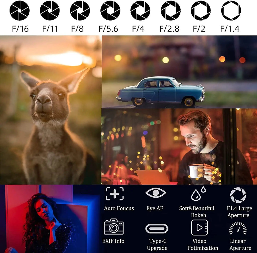 Wide view angle with F 1.4 Large Aperture easy to get soft and beautiful Bokeh