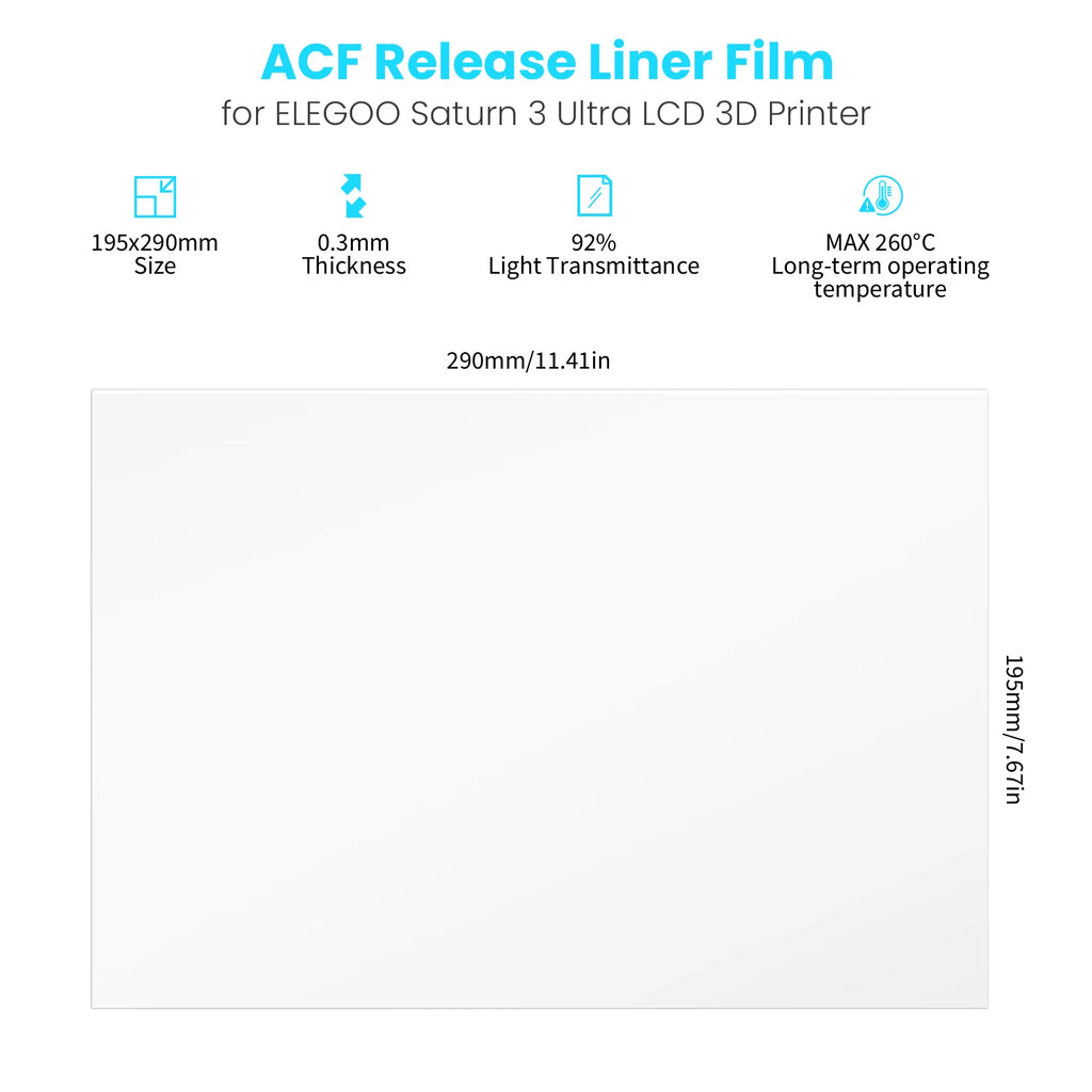 Compatible with ELEGOO Saturn 3 Ultra resin 3D printer. Film dimensions: 290*195mm; Film thickness: 0.3mm.