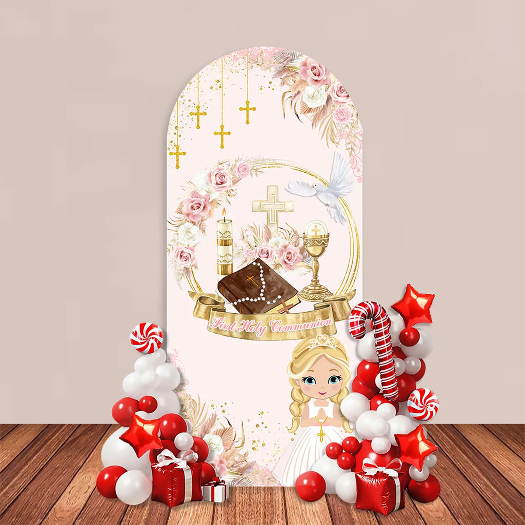 First Holy Communion Arch Backdrop Cover Wood Cross Baptism Boy Girl Boho Blue Cyan Flowers Party Decor Gold Bless Background