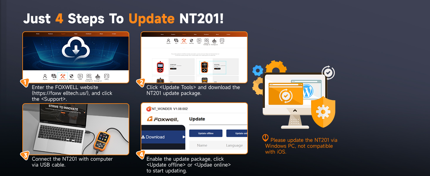 One purchase gives you all available functions of NT201 without any additional fees. FOXWELL provides lifetime free updates, you can upgrade the software via Windows 7/8/10 to keep your NT201 stay the latest software version.