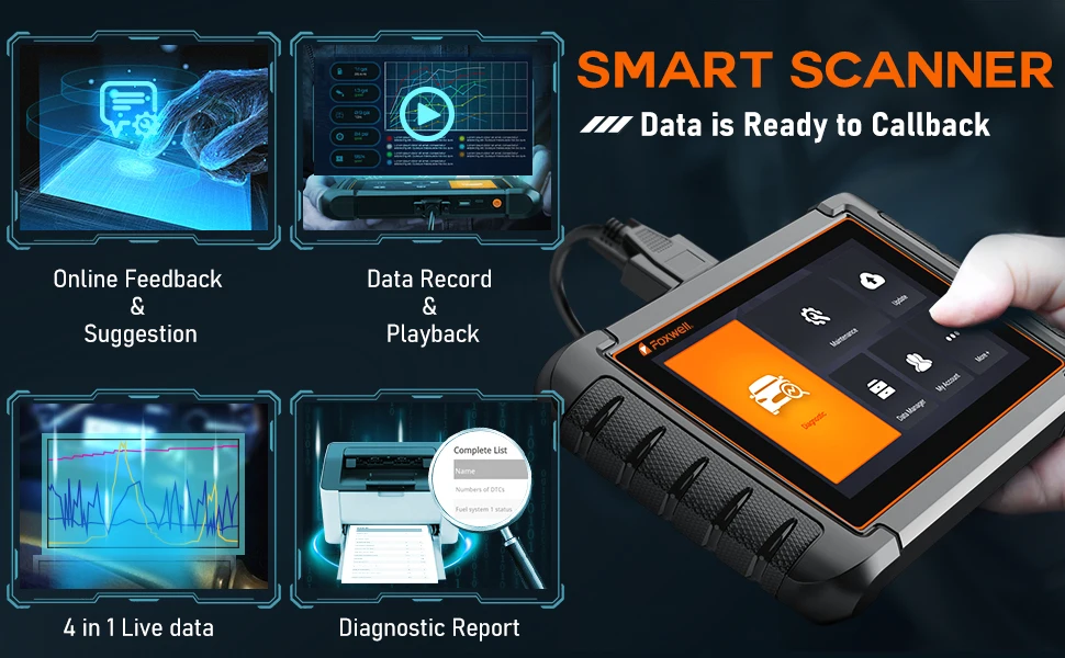 screenshot, record video, one-click update, remote diagnostic, quick support, testing report, data stream record & playback & print, diagnostic feedback, etc.