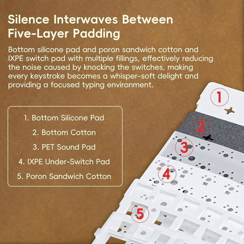 • The AKS068PRO wired keyboard takes the typing experience to a new level by incorporating a gasket-mounted assembly, coupled with a flex-cut PC Mounting plate and PCB. The gasket mount isolates the typing plate from the rest of the case, coupled with 5 layers of sound-absorbing material, significantly reducing vibrations and producing a more consistent, satisfying sound.