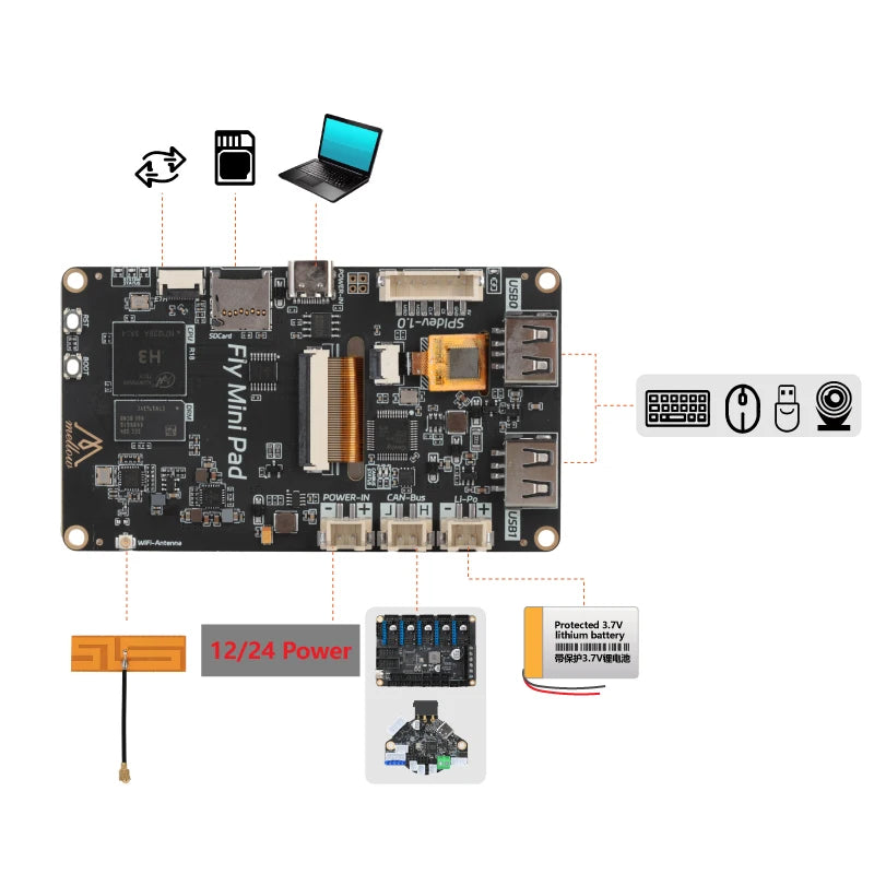 This Mini Pad is specially designed for Klipper firmware, supporting 2.4G WiFi connectivity, and can be used as a host machine. It provides CAN port connection and is capable of wirelessly connecting to Klipper firmware 3D printers within a local area network. The equipped battery pack facilitates easy mobility. Moreover, the Mini Pad also makes it convenient for customers to retrofit old 3D printers to Klipper firmware, offering a handy upgrade option.