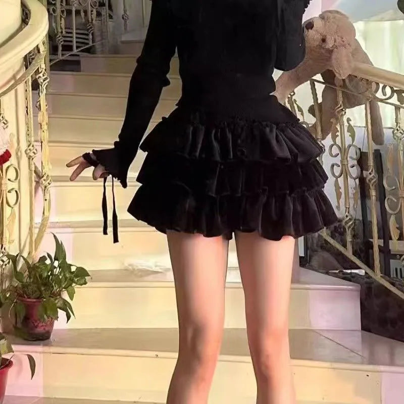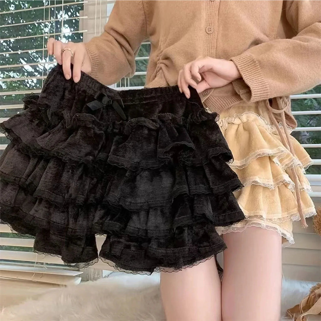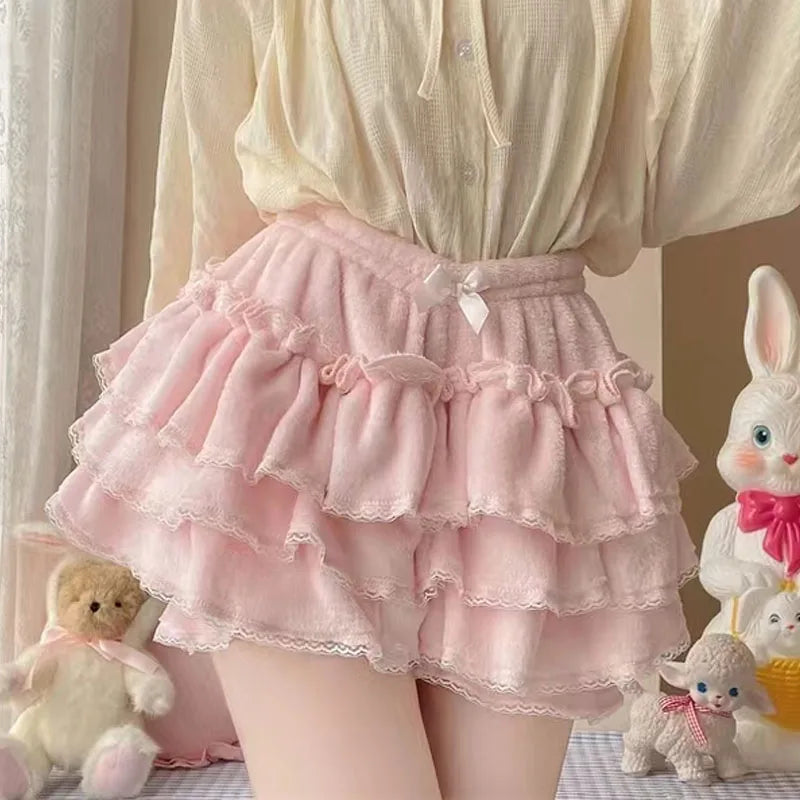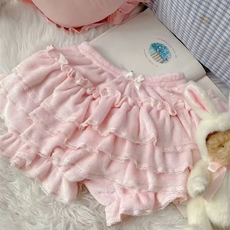 Pink JK Plush Shorts Winter Sweet Lolita Safety Short Pants Women Japanese Kawaii Ruffles Bloomers Harajuku Y2k Pumpkin Pants