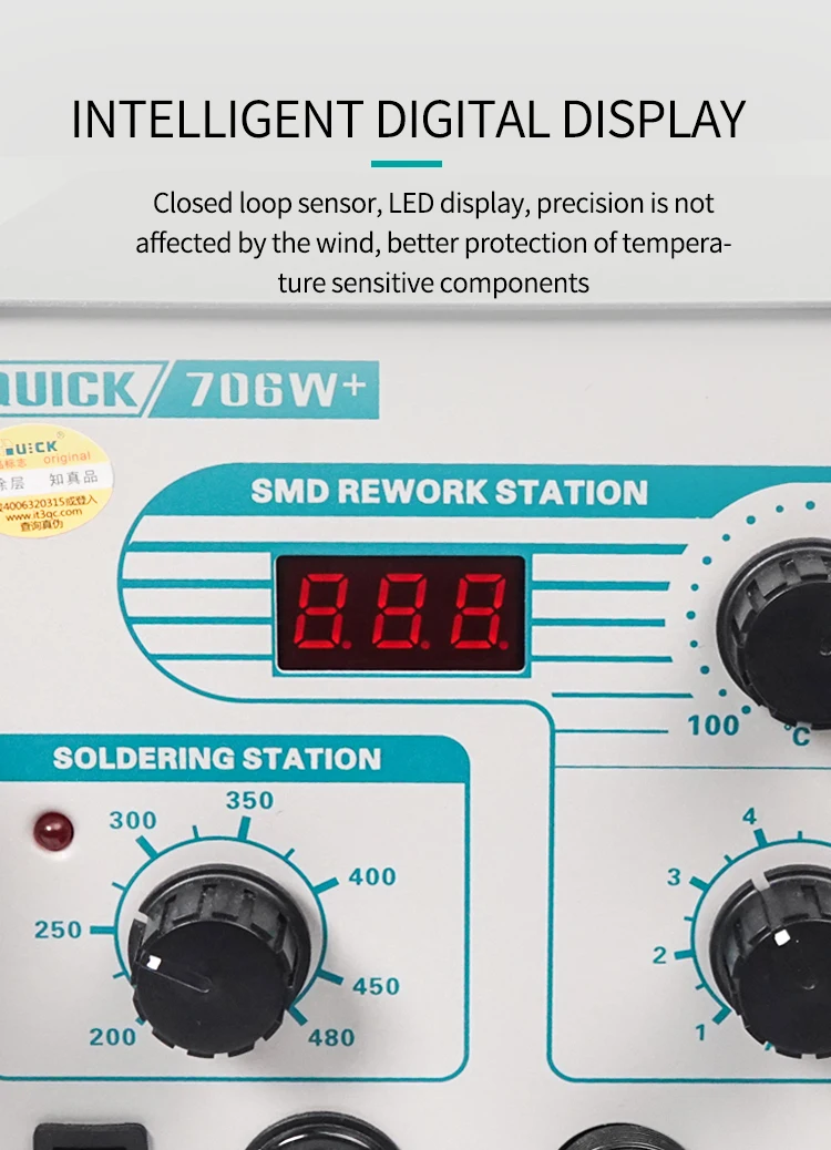 1.Original Quick smd rework station.Closed loop sensor. Large power and rapid heating. Temperature can be conveniently adjusted and