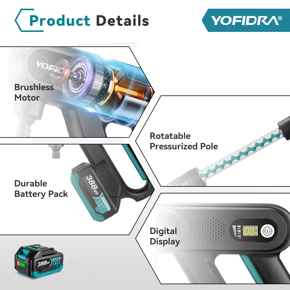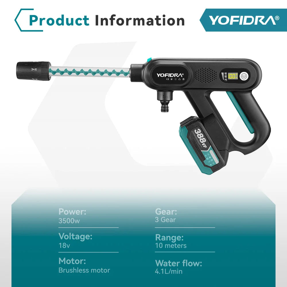 YOFIDRA 220Bar Brushless Electric High Pressure Car Washer Gun 3 Gear Water Spray Gun Household Garden Tools For Makita Battery