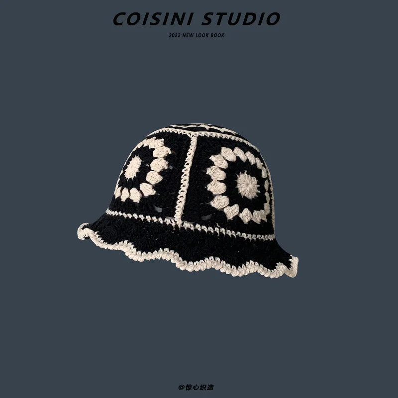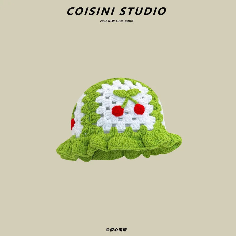 2024 New Korean-Japanese Hand Buckle Crochet Bucket Hat Spring and Autumn Winter Sun Hat Female Cherry Designer Bob Basin Hat