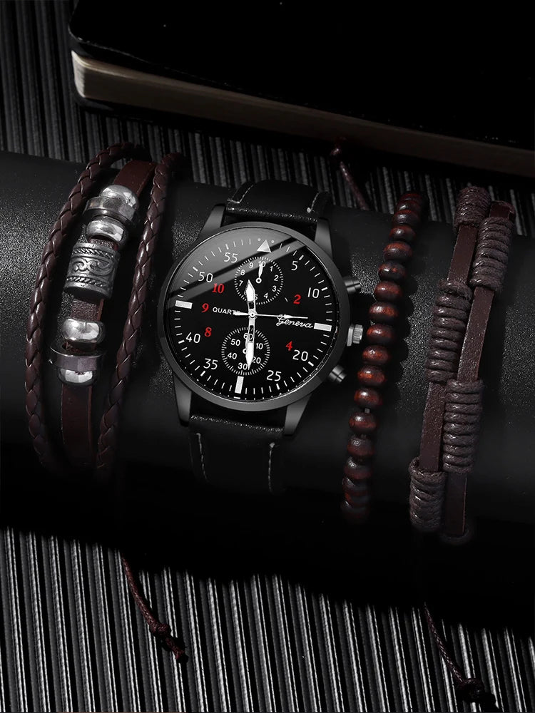 4pcs Fashion Business Casual Men's Belt Quartz Watch with PU Woven Bracelet Set