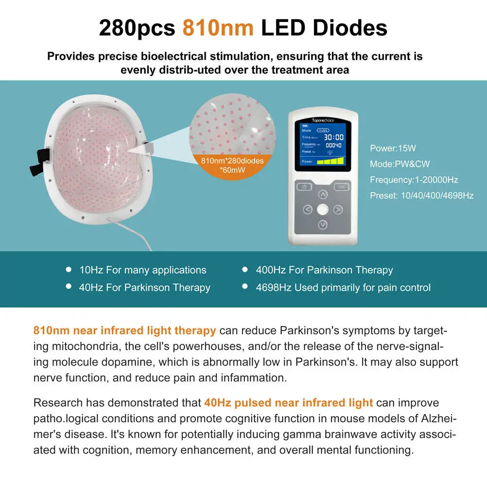 【810nm Light Therapy Helmet】810nm helmet therapy is a NIR light therapy or photobiomodulation (PBM) brain therapy device for brain disease therapy. Enhances cellular respiration by stimulating mitochondria, increasing ATP production for cellular repair and regeneration. The therapy also promotes nitric oxide release, improving cerebral blood flow, and provides neuroprotection by reducing oxidative stress and stimulating neurogenesis. Additionally, it modulates neuroinflammation, supporting a healthier brain environment.